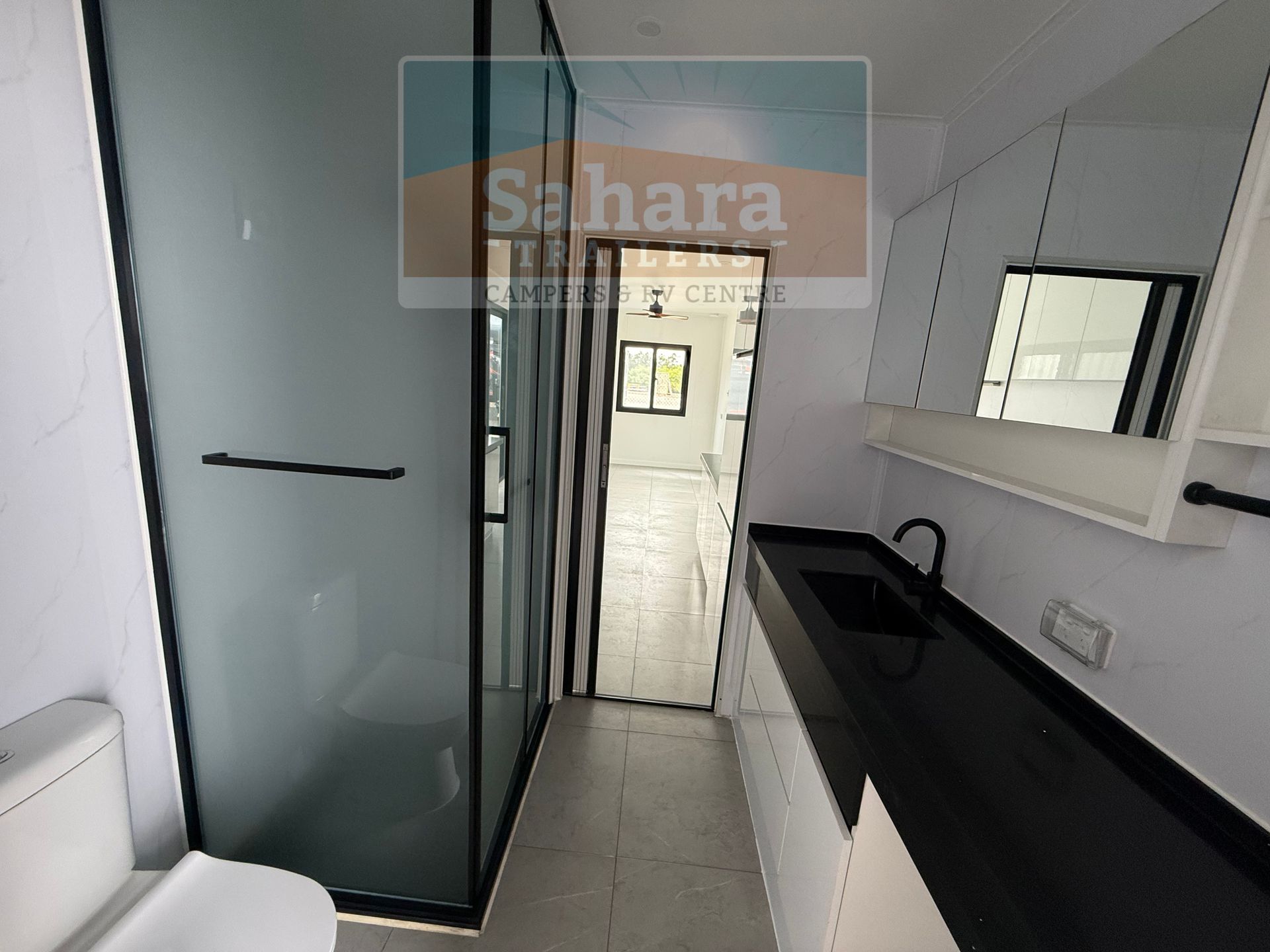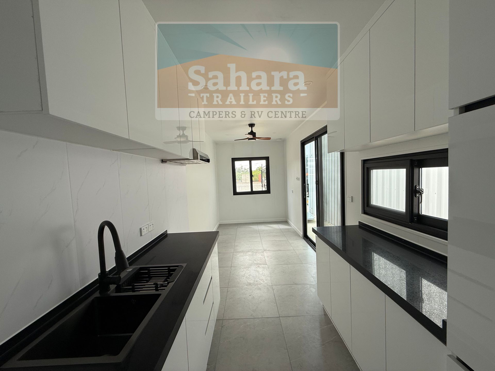 The design includes a separate master bedroom, living room, full kitchen, and bathroom, giving you the space and convenience of a small home in a compact, portable structure.