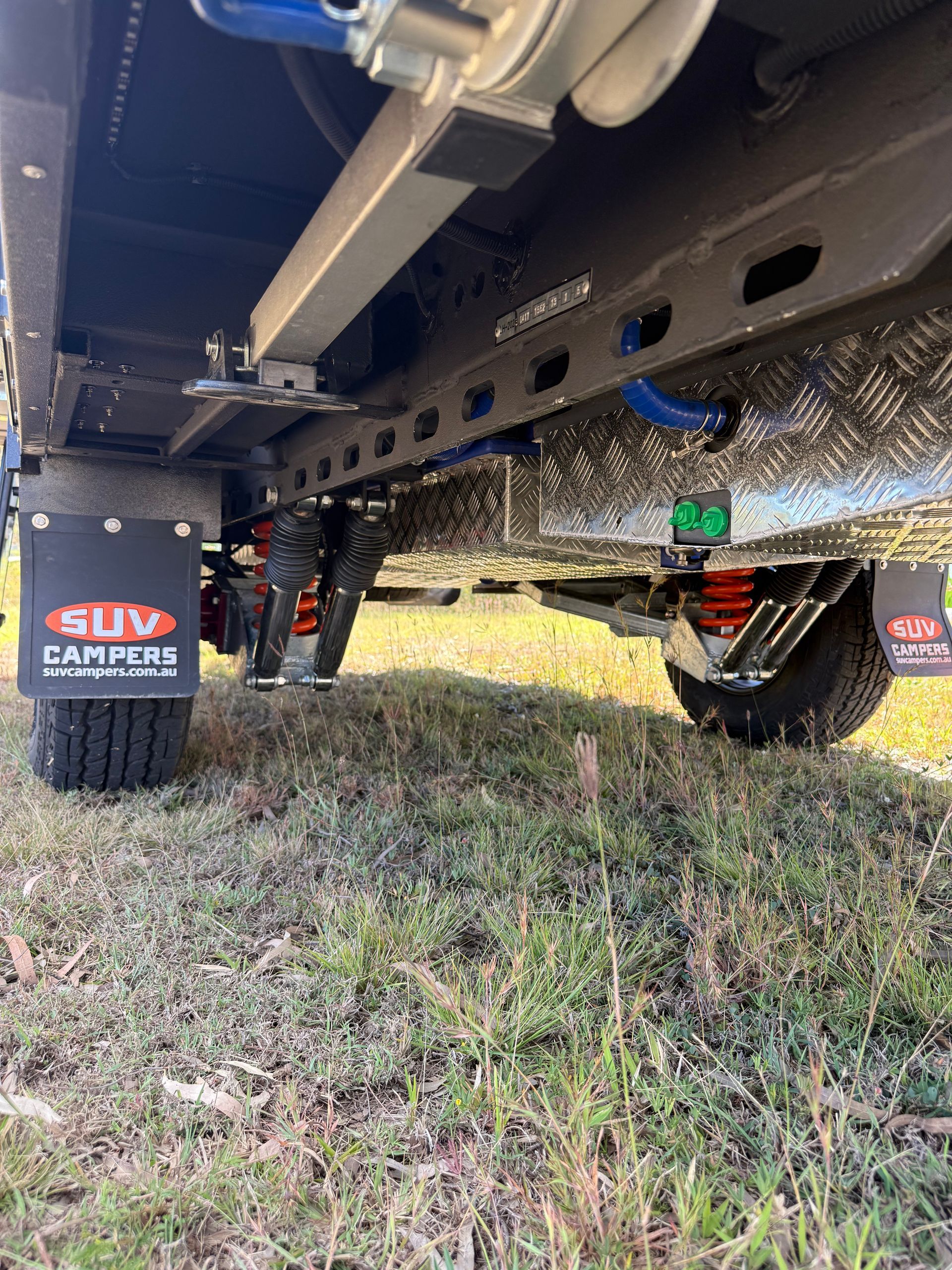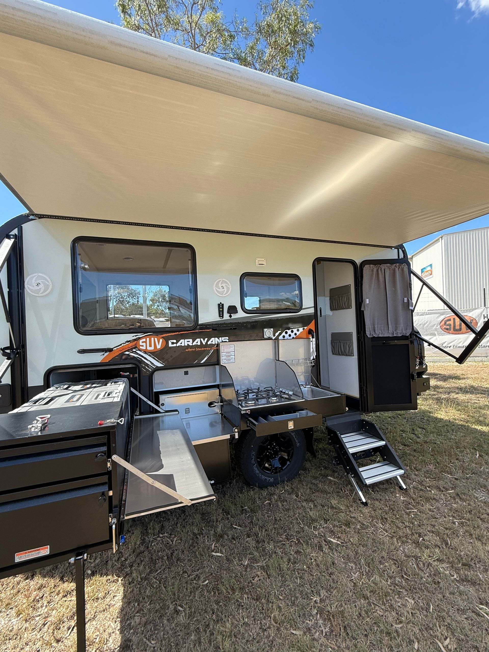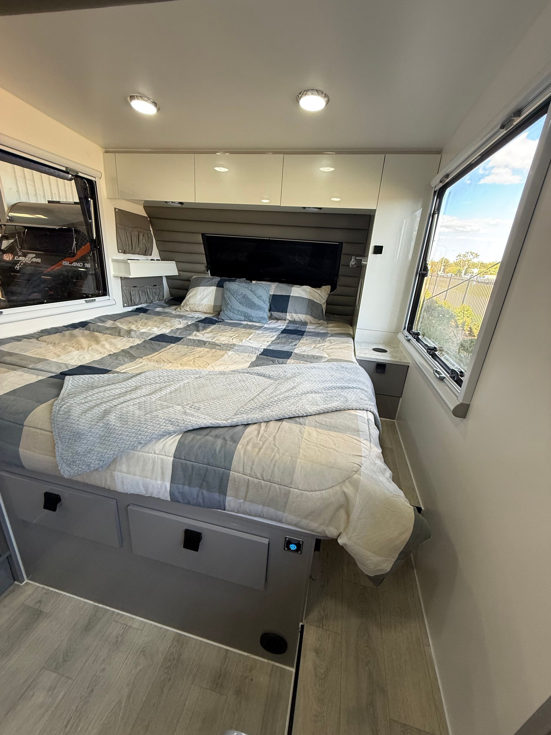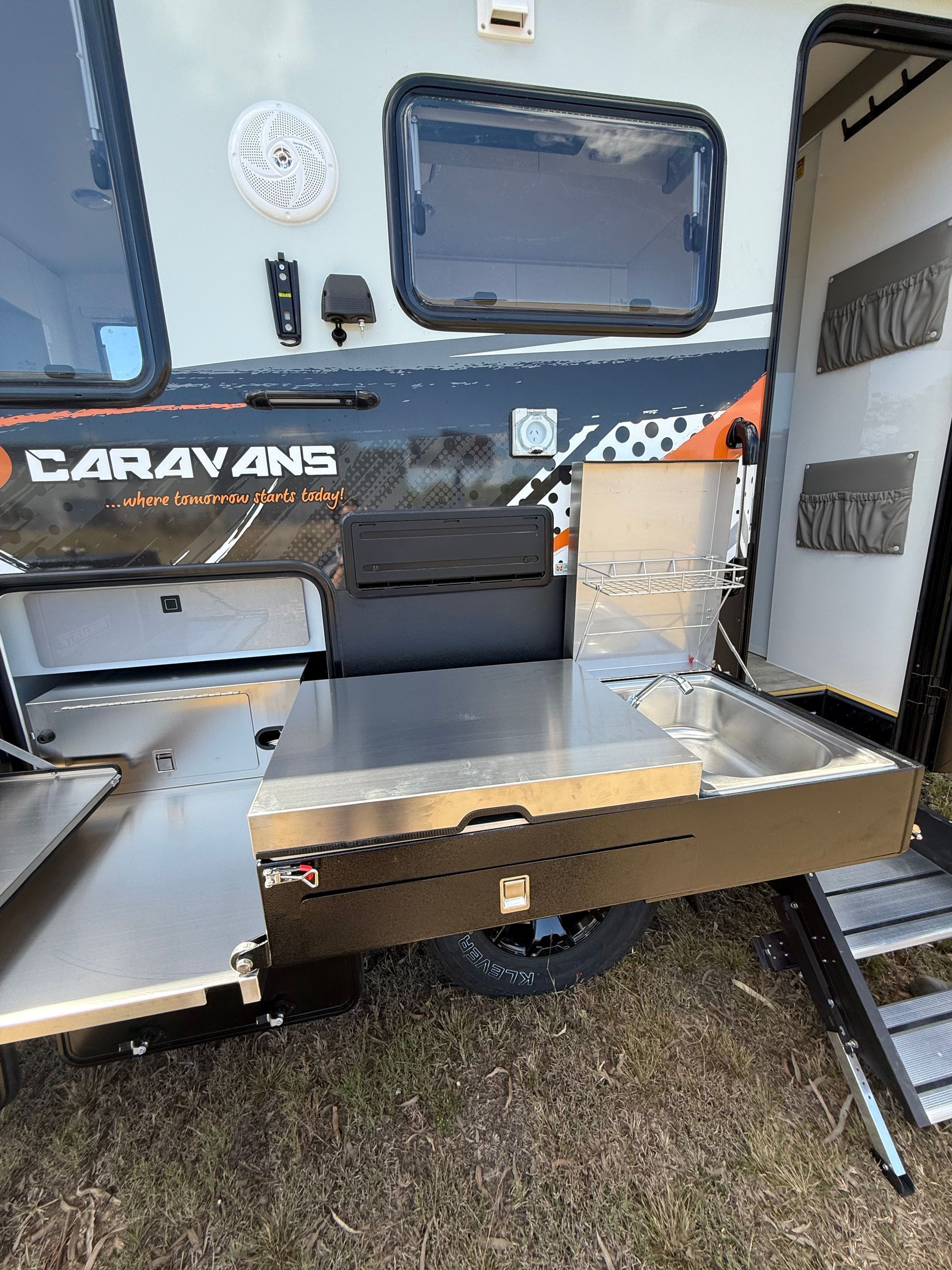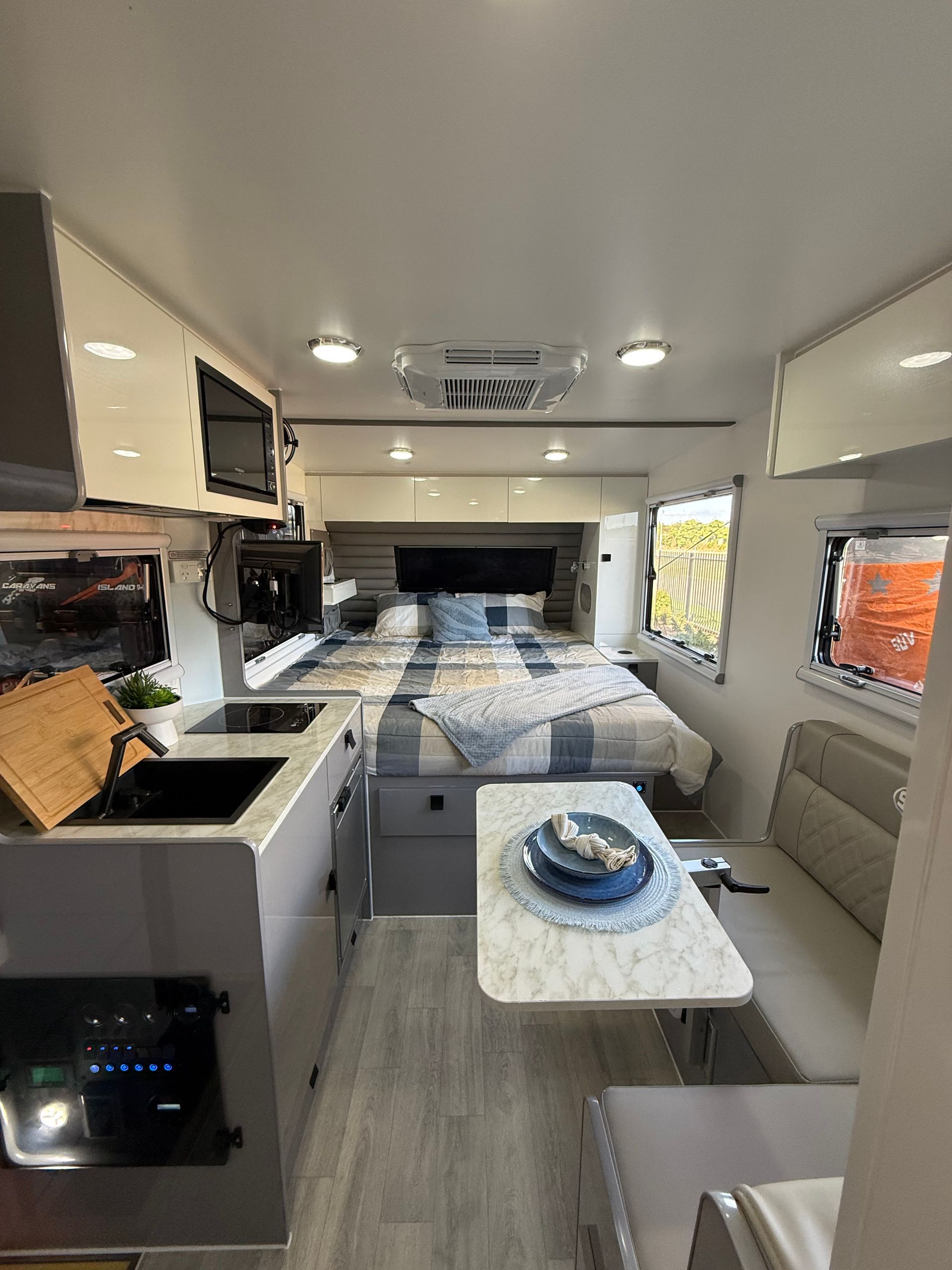 Our latest 14-footer packs a king bed, a cosy corner couch, and true separate toilet & shower rooms—because roughing it shouldn’t mean doing without. Cook inside or out, keep warm with the diesel heater, and run the good gear off 600W solar, 600Ah lithium, and a 3000W inverter. The new built-in double fold-out entry step makes getting in as easy as knocking off on a Friday.