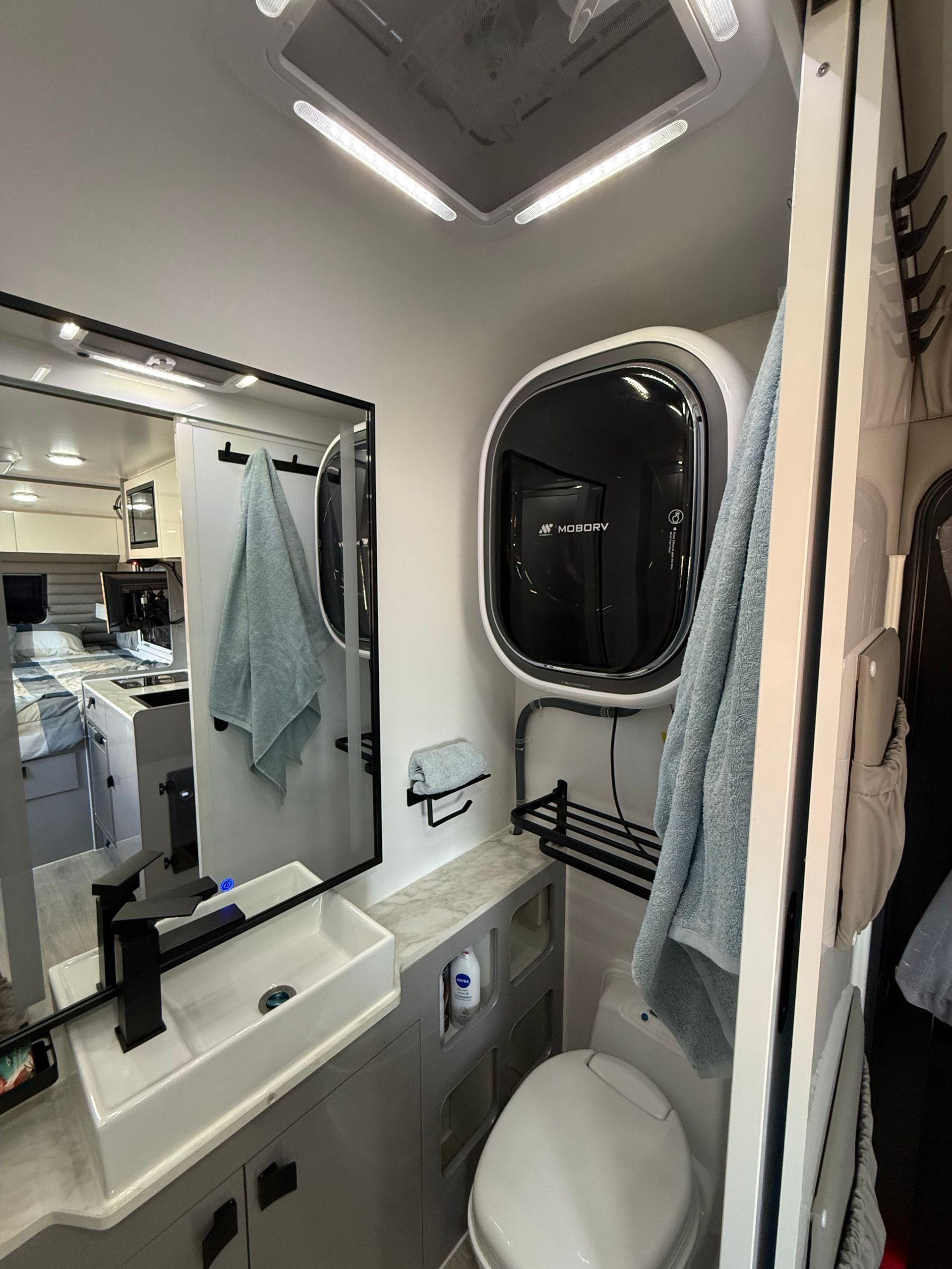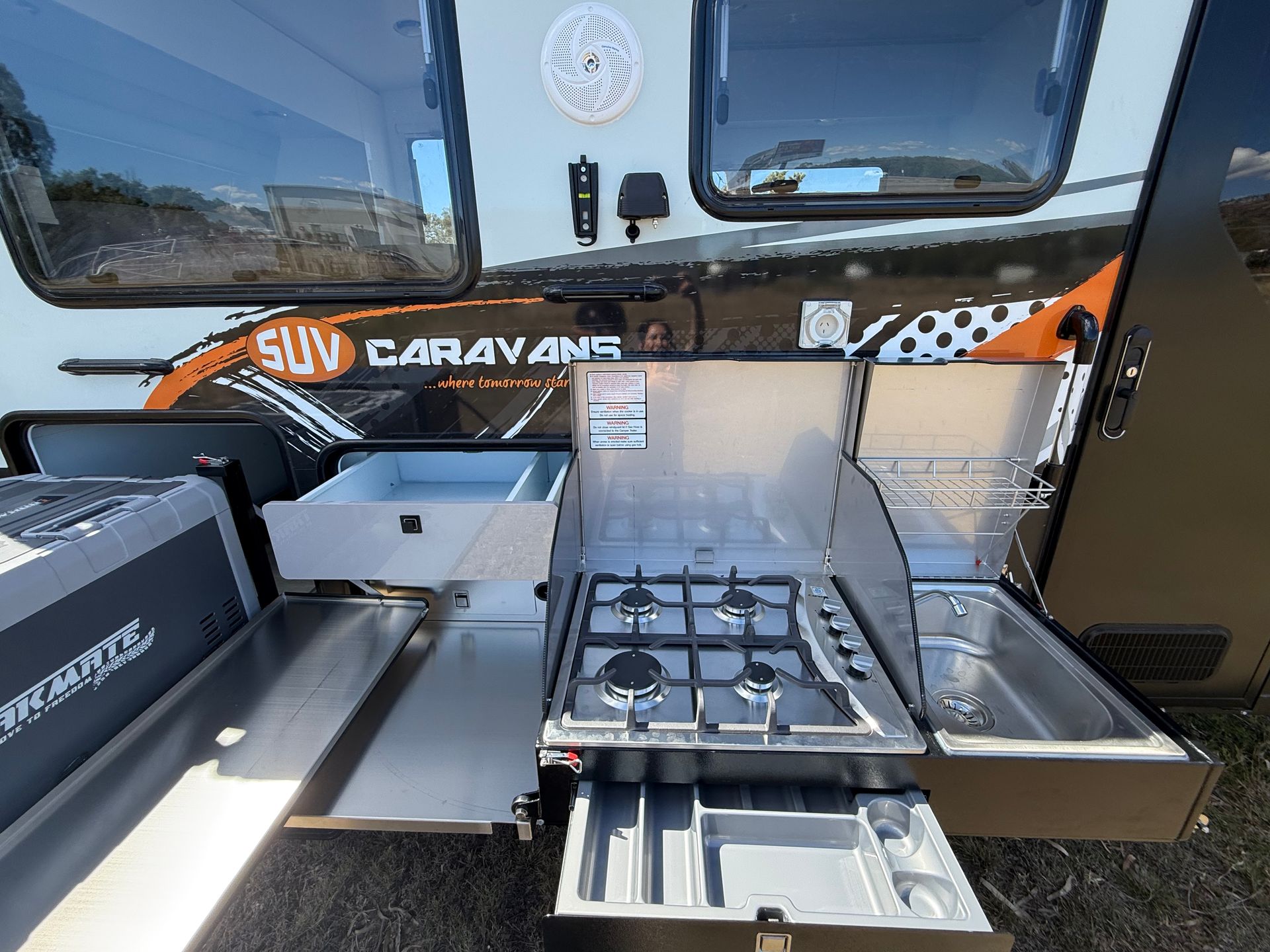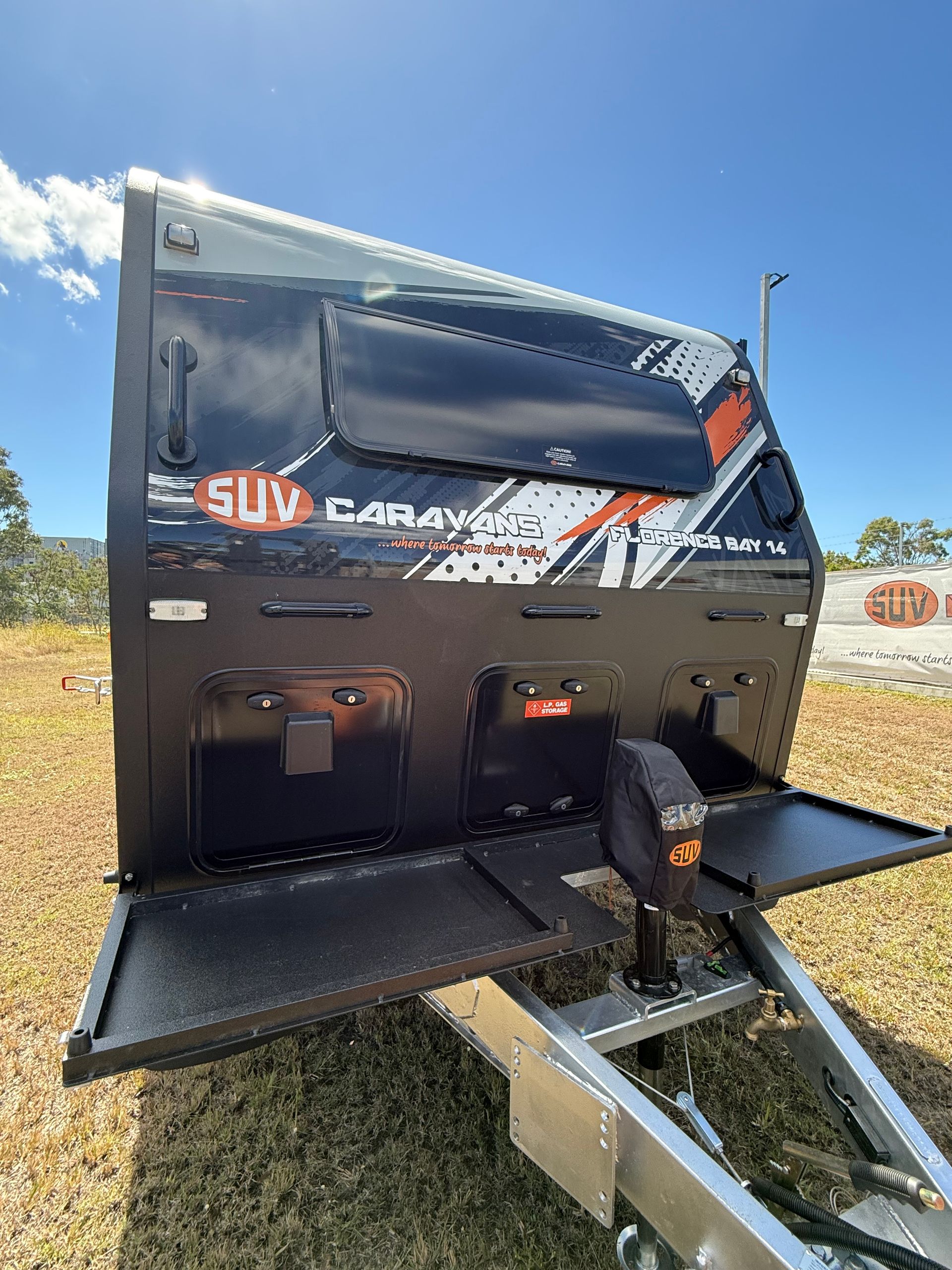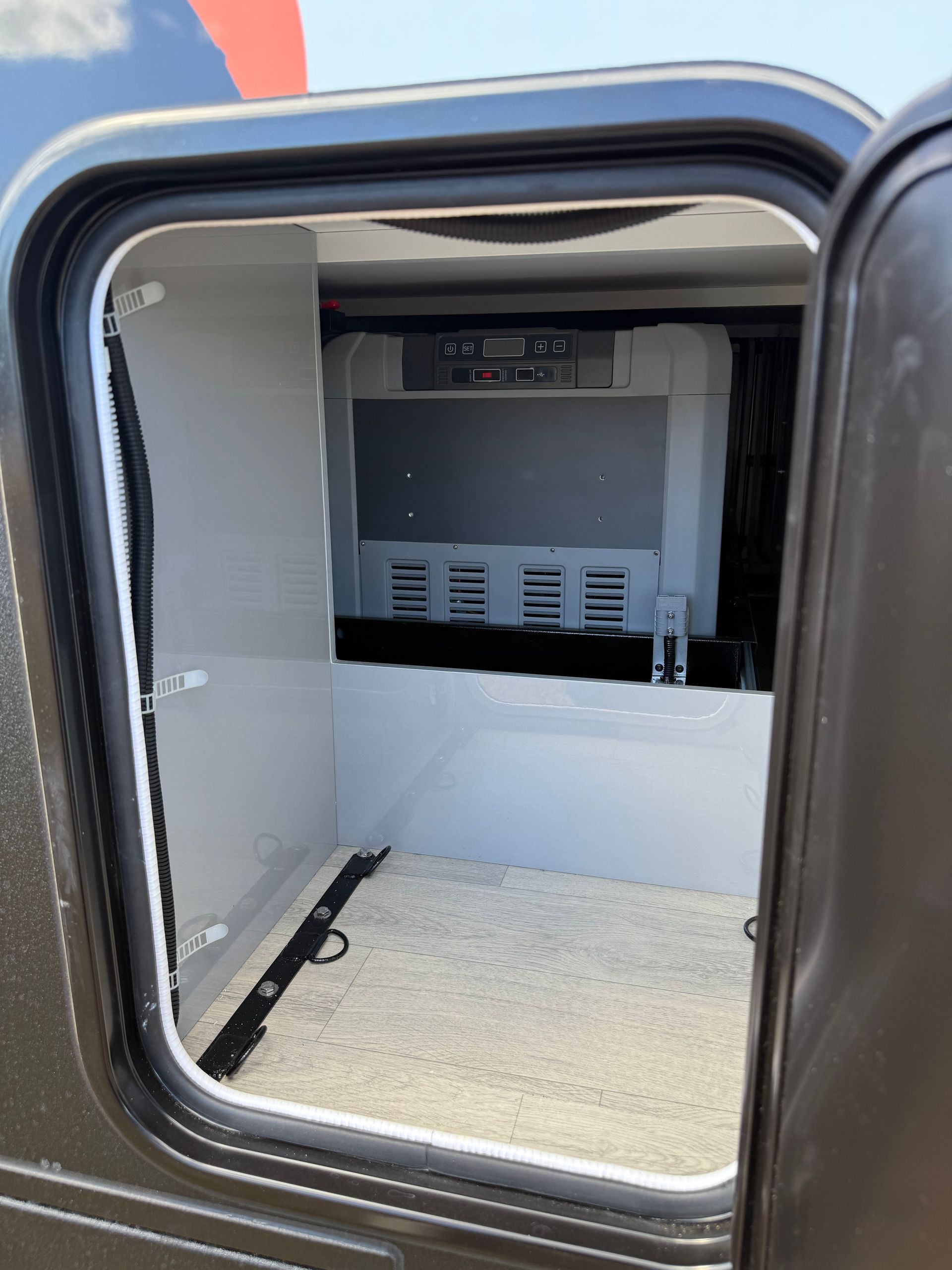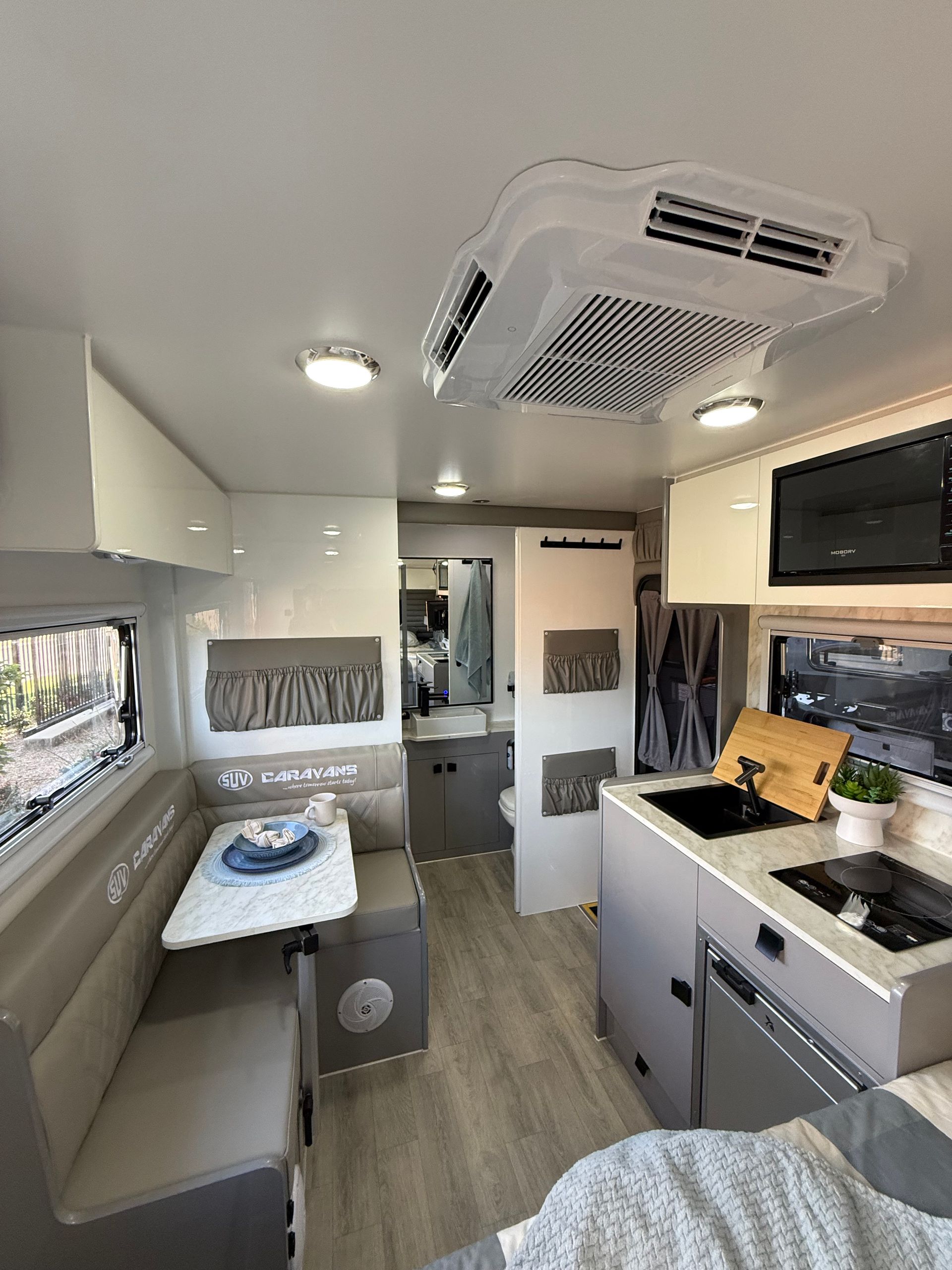 Our latest 14-footer packs a king bed, a cosy corner couch, and true separate toilet & shower rooms—because roughing it shouldn’t mean doing without. Cook inside or out, keep warm with the diesel heater, and run the good gear off 600W solar, 600Ah lithium, and a 3000W inverter. The new built-in double fold-out entry step makes getting in as easy as knocking off on a Friday.