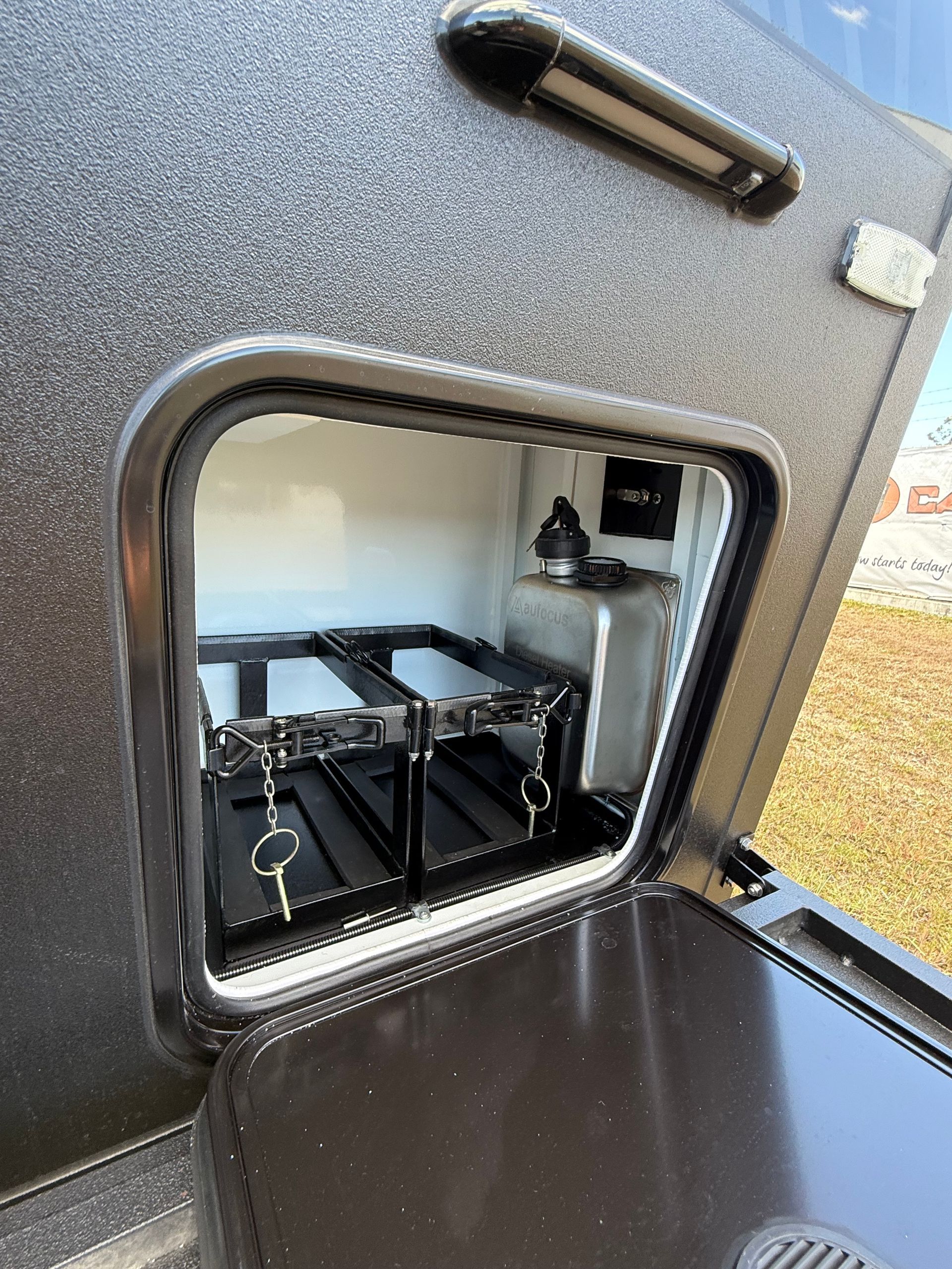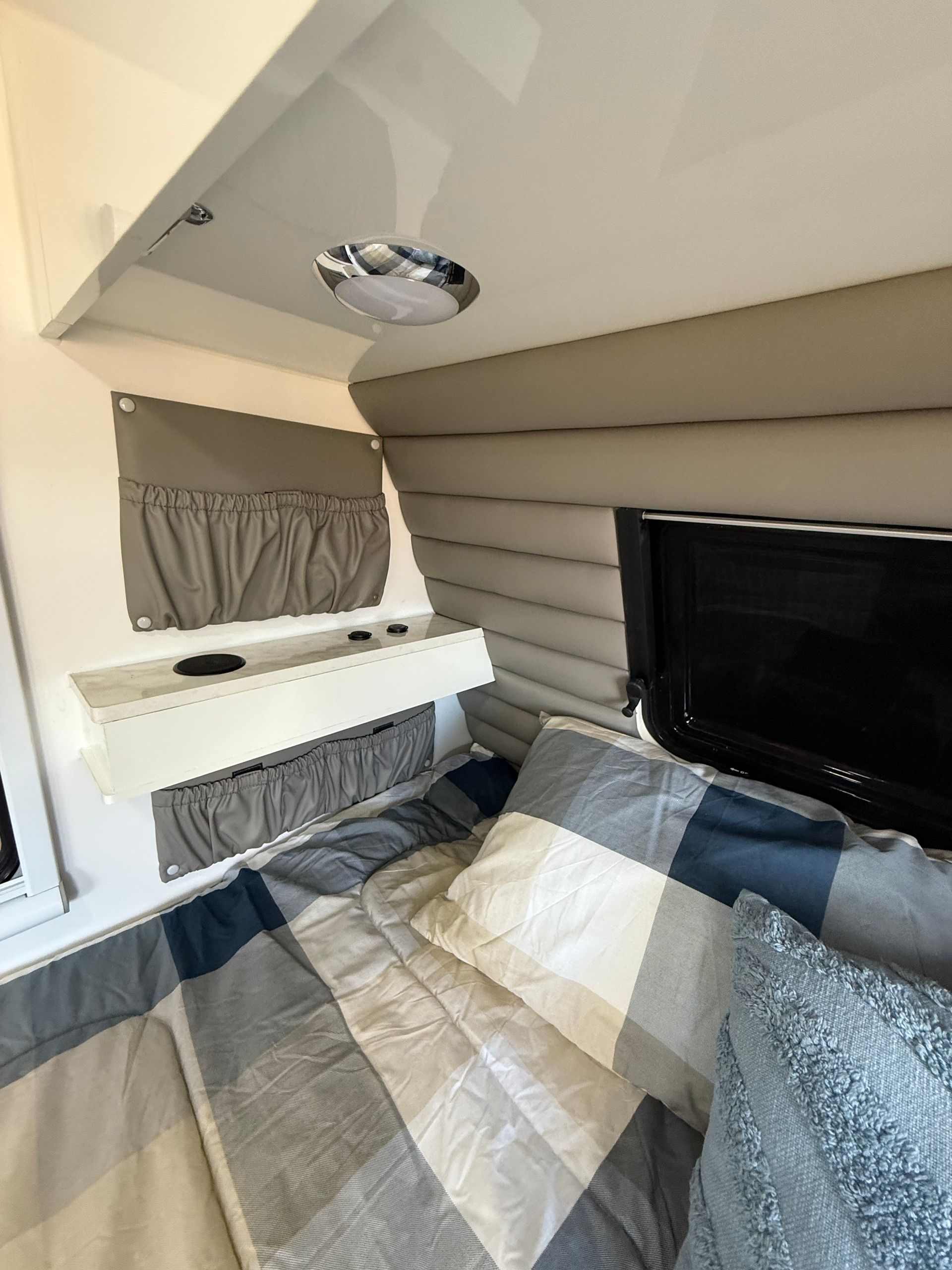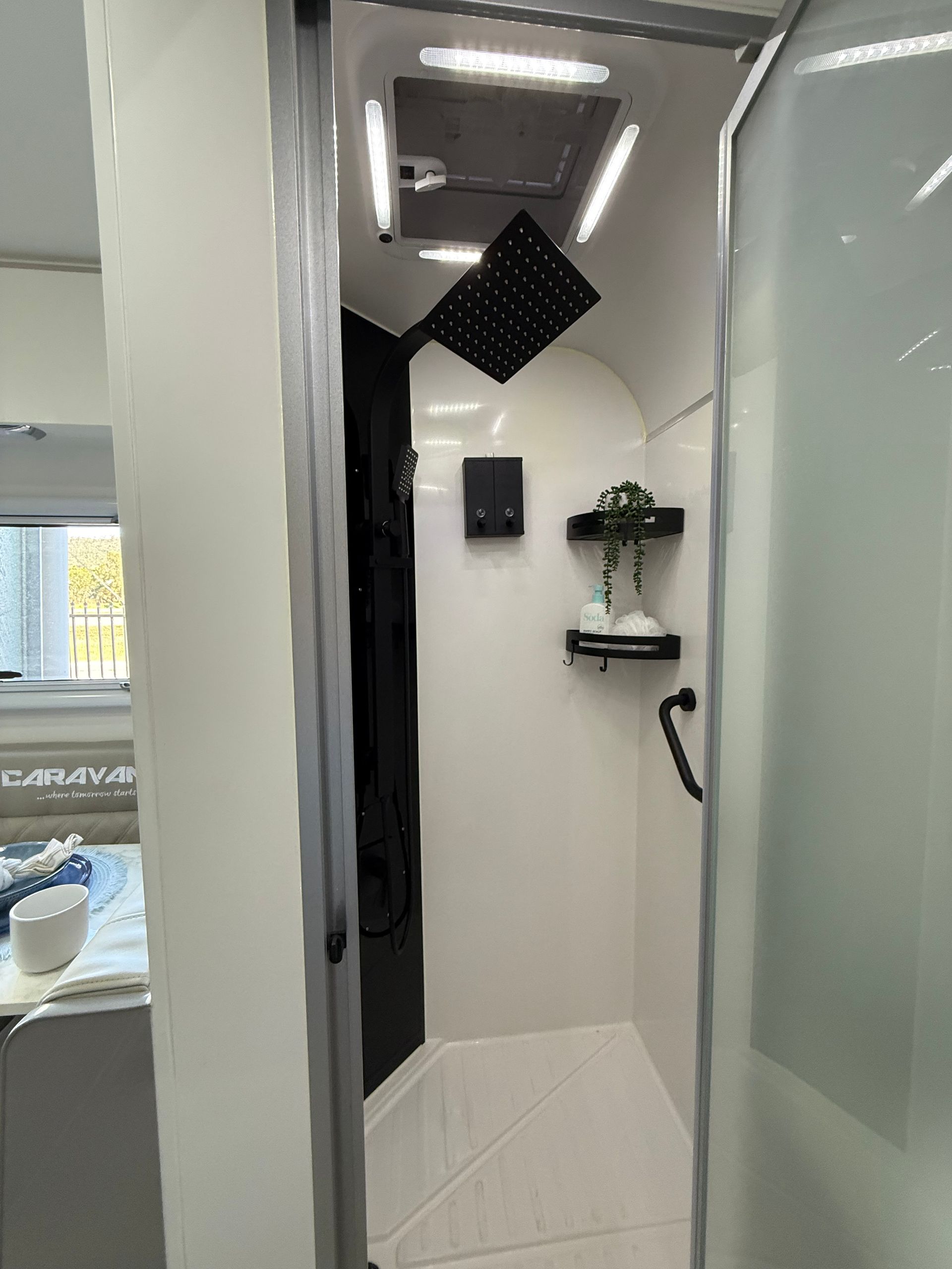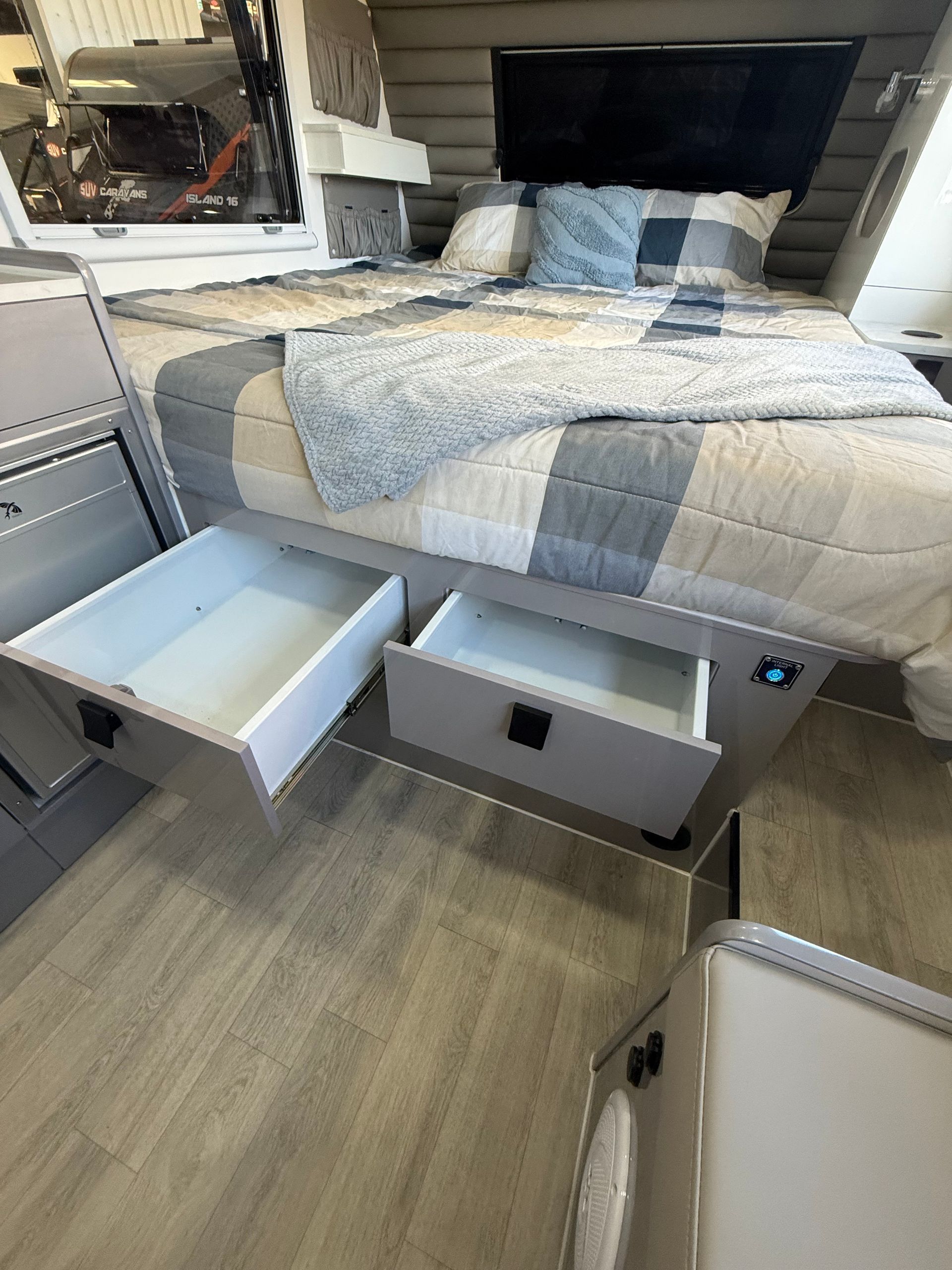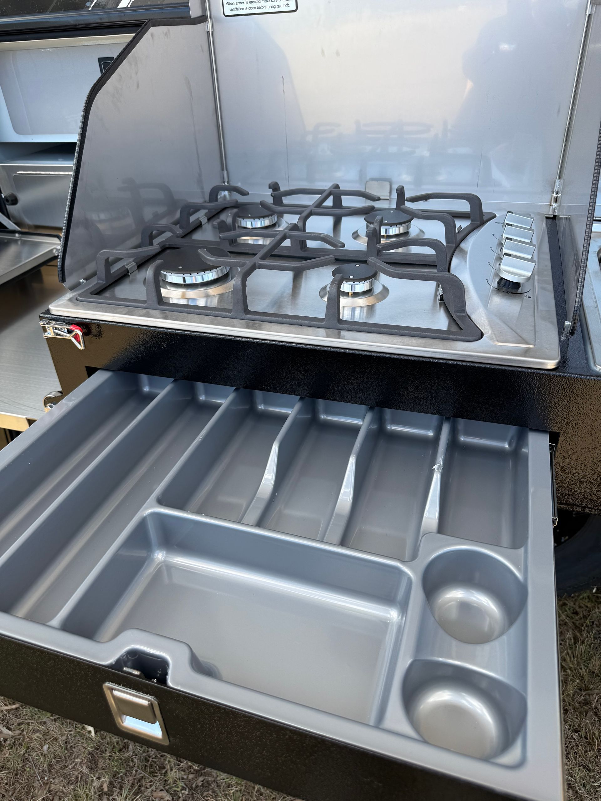 Our latest 14-footer packs a king bed, a cosy corner couch, and true separate toilet & shower rooms—because roughing it shouldn’t mean doing without. Cook inside or out, keep warm with the diesel heater, and run the good gear off 600W solar, 600Ah lithium, and a 3000W inverter. The new built-in double fold-out entry step makes getting in as easy as knocking off on a Friday.