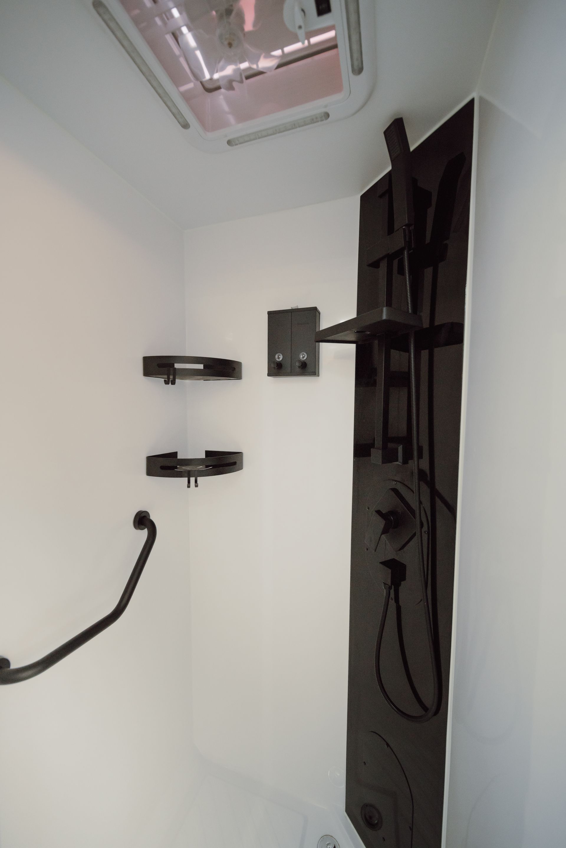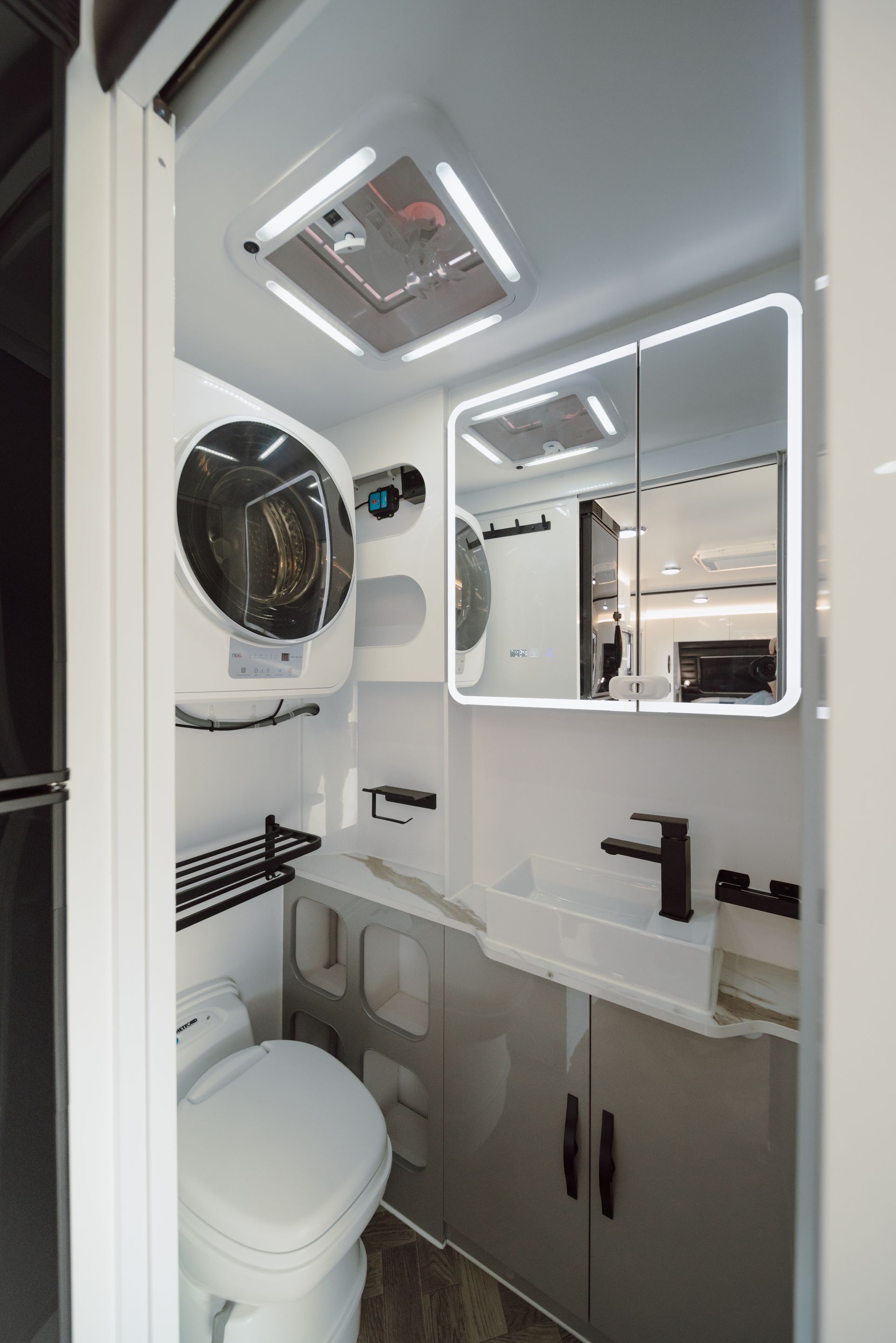 Cooking is effortless thanks to the external kitchen with fridge drawer and push-button rollout awning as standard, complemented by an internal kitchenette featuring a built-in microwave, induction cooktop, full-size fridge/freezer and sink. The full ensuite completes the package, with separate shower and toilet rooms and a wall-mounted washing machine — delivering the kind of convenience typically reserved for larger touring caravans. The GR17.6 is versatility at its finest.