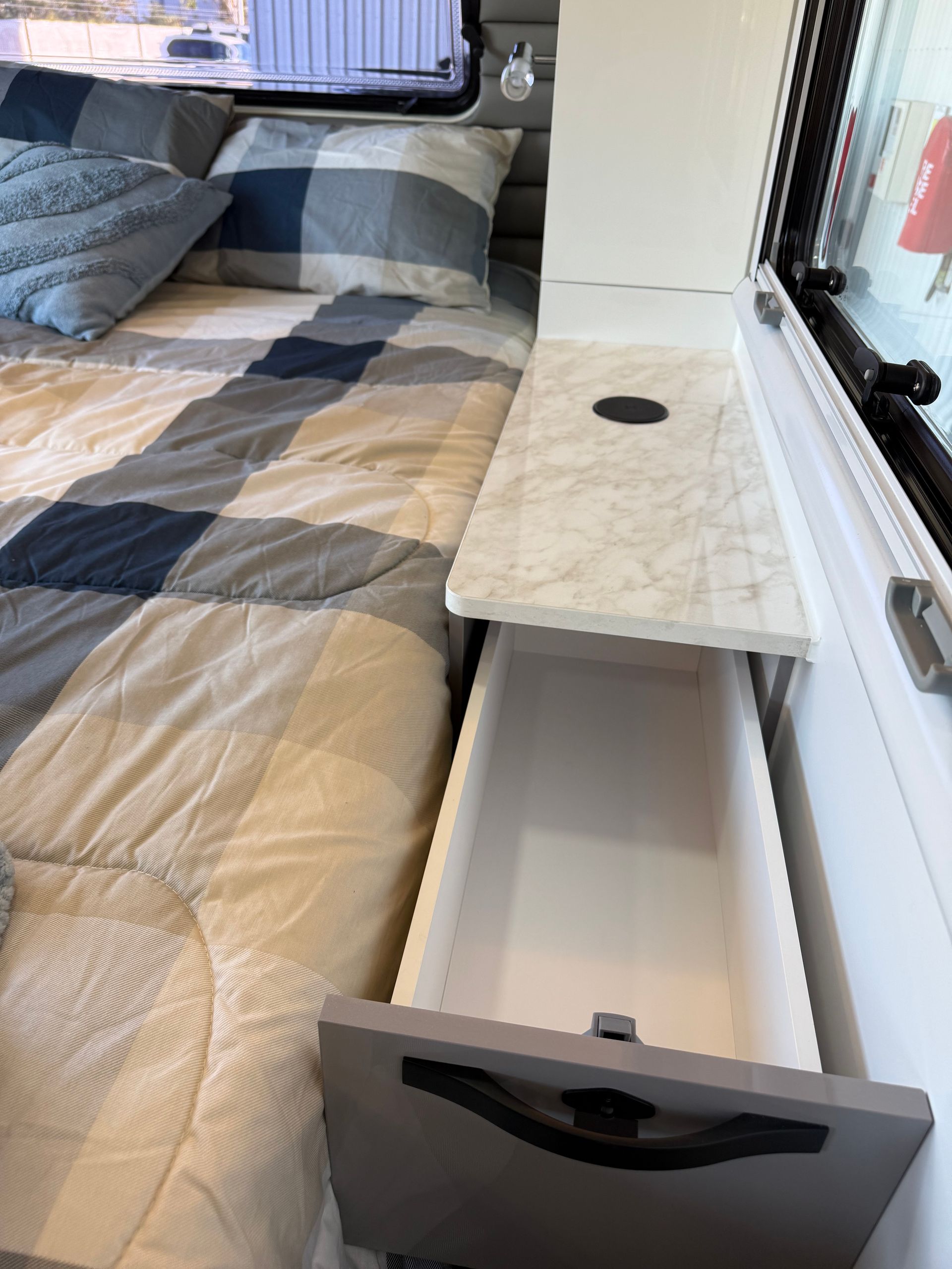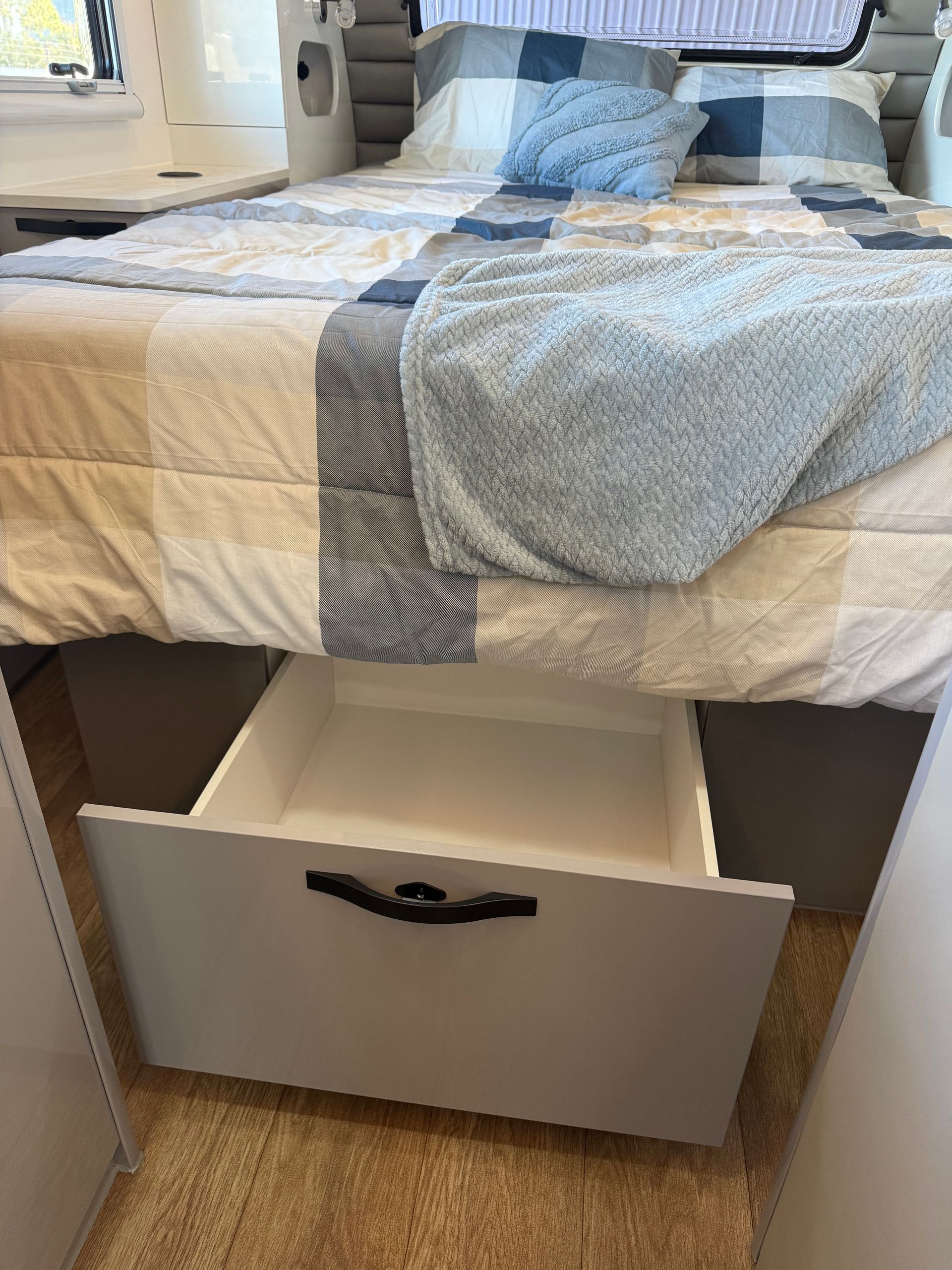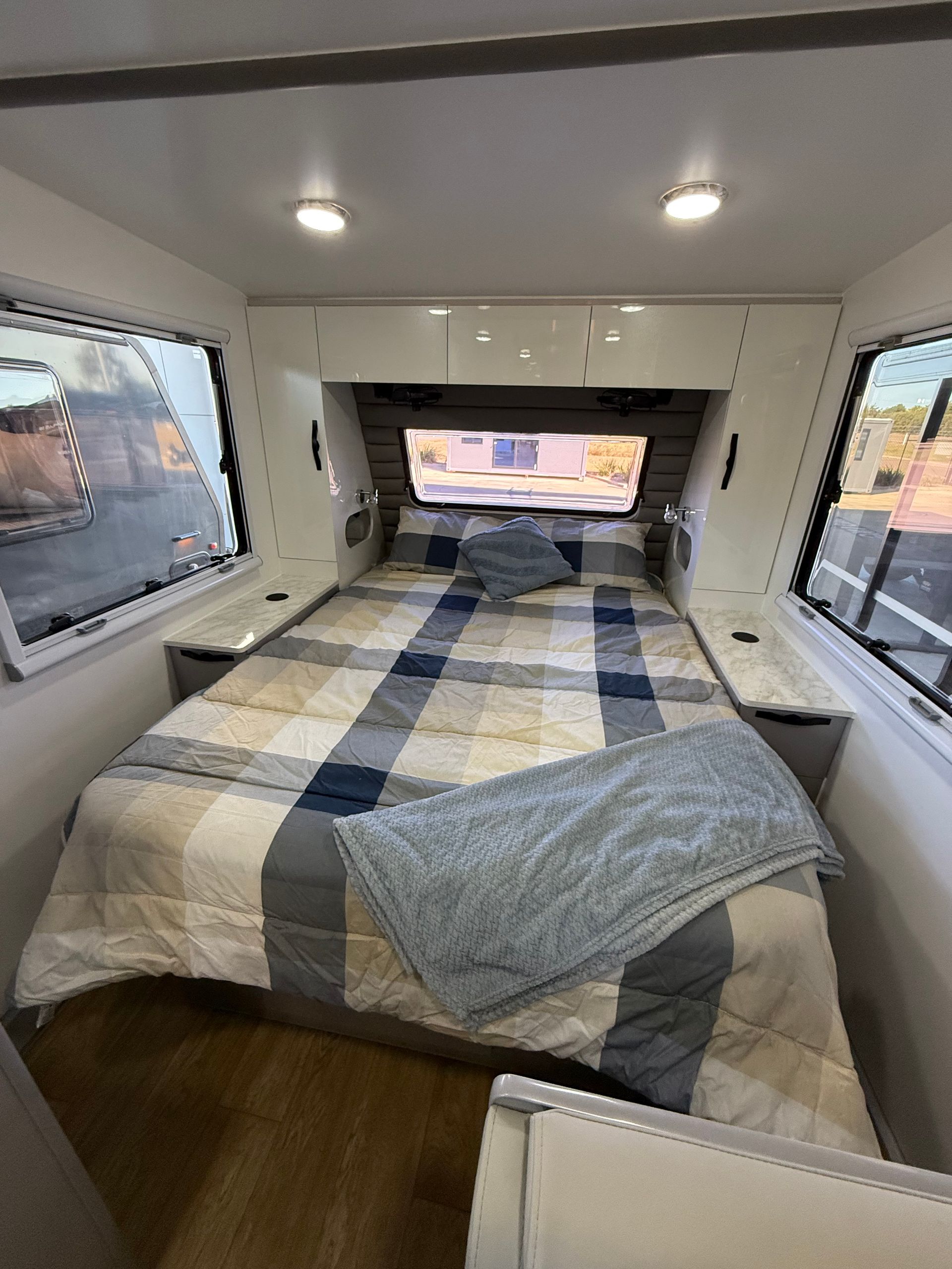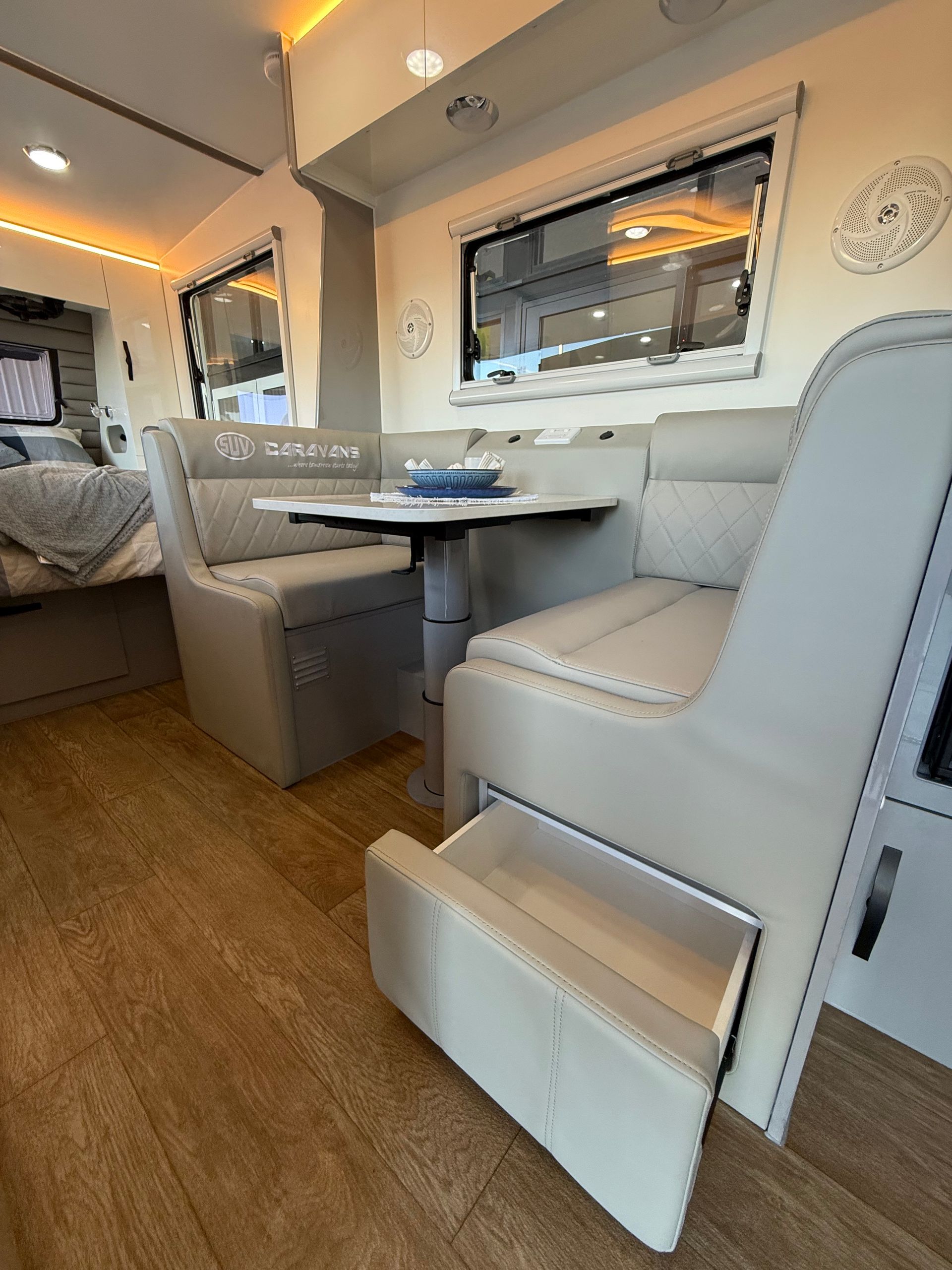 Featuring our famous walk around island bed, external kitchen with fridge drawer and push button rollout awning as standard.
