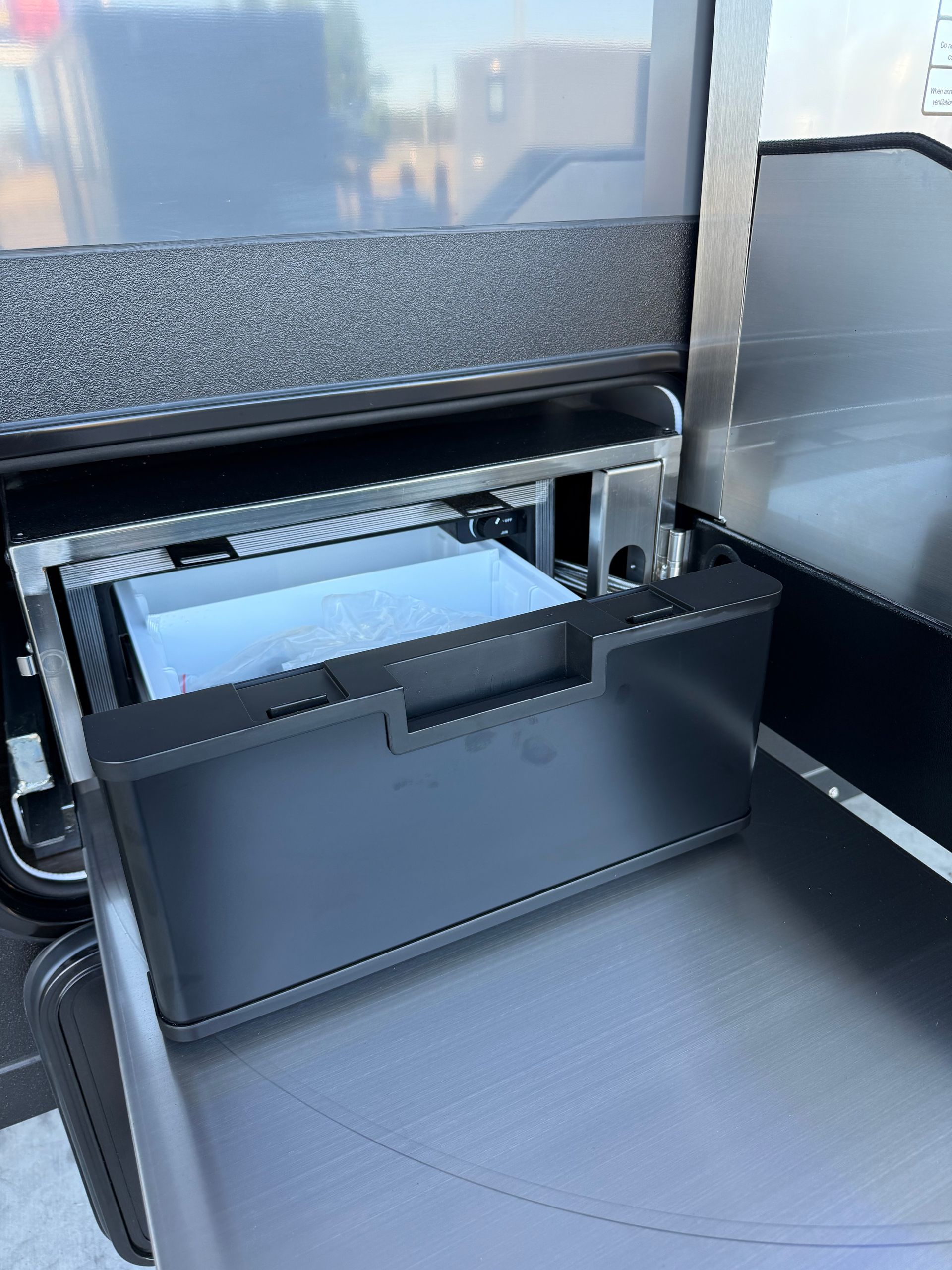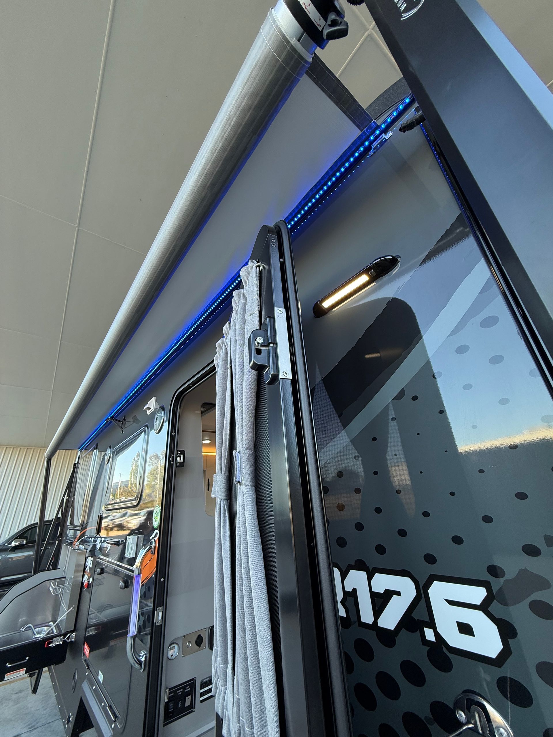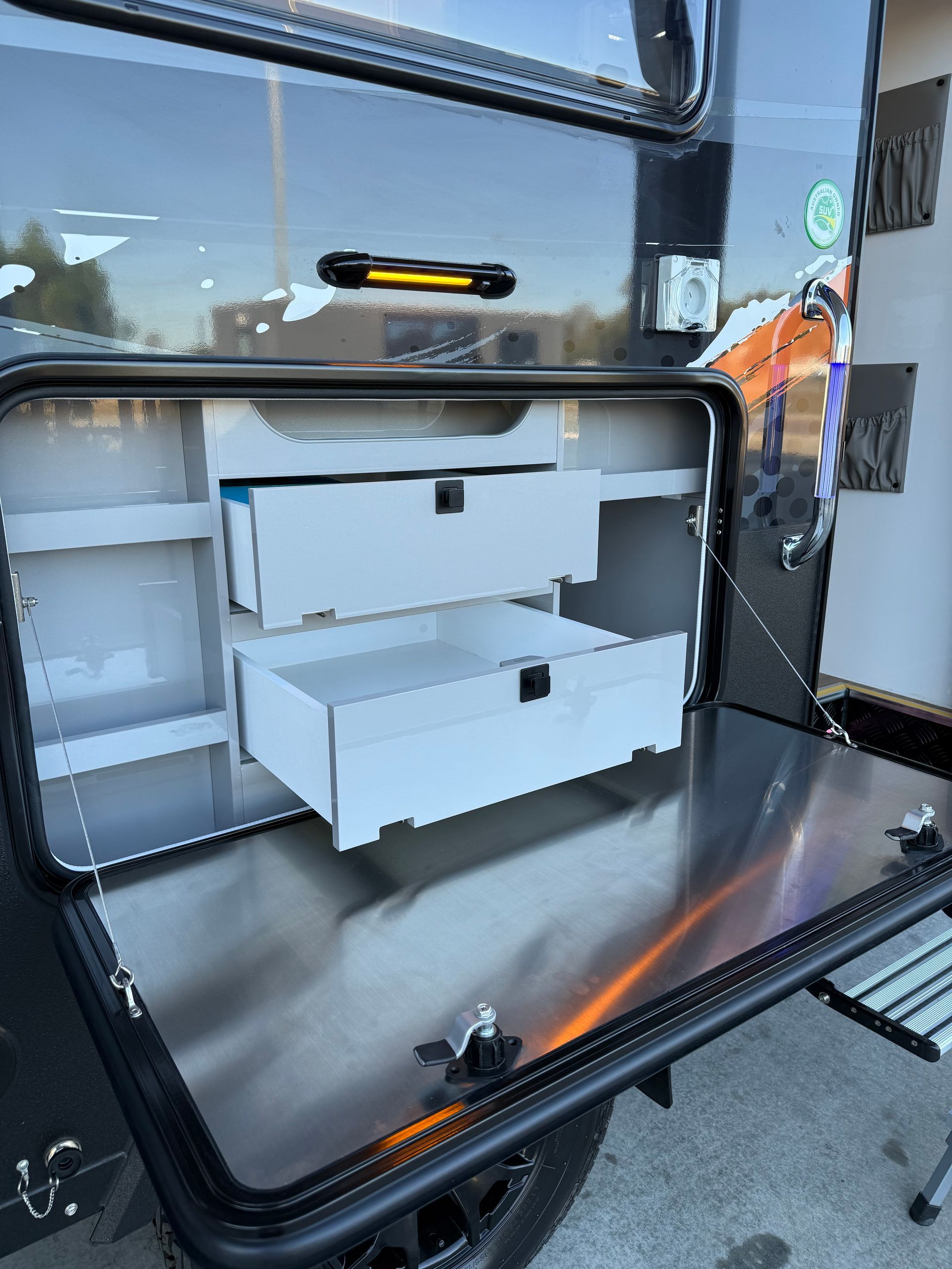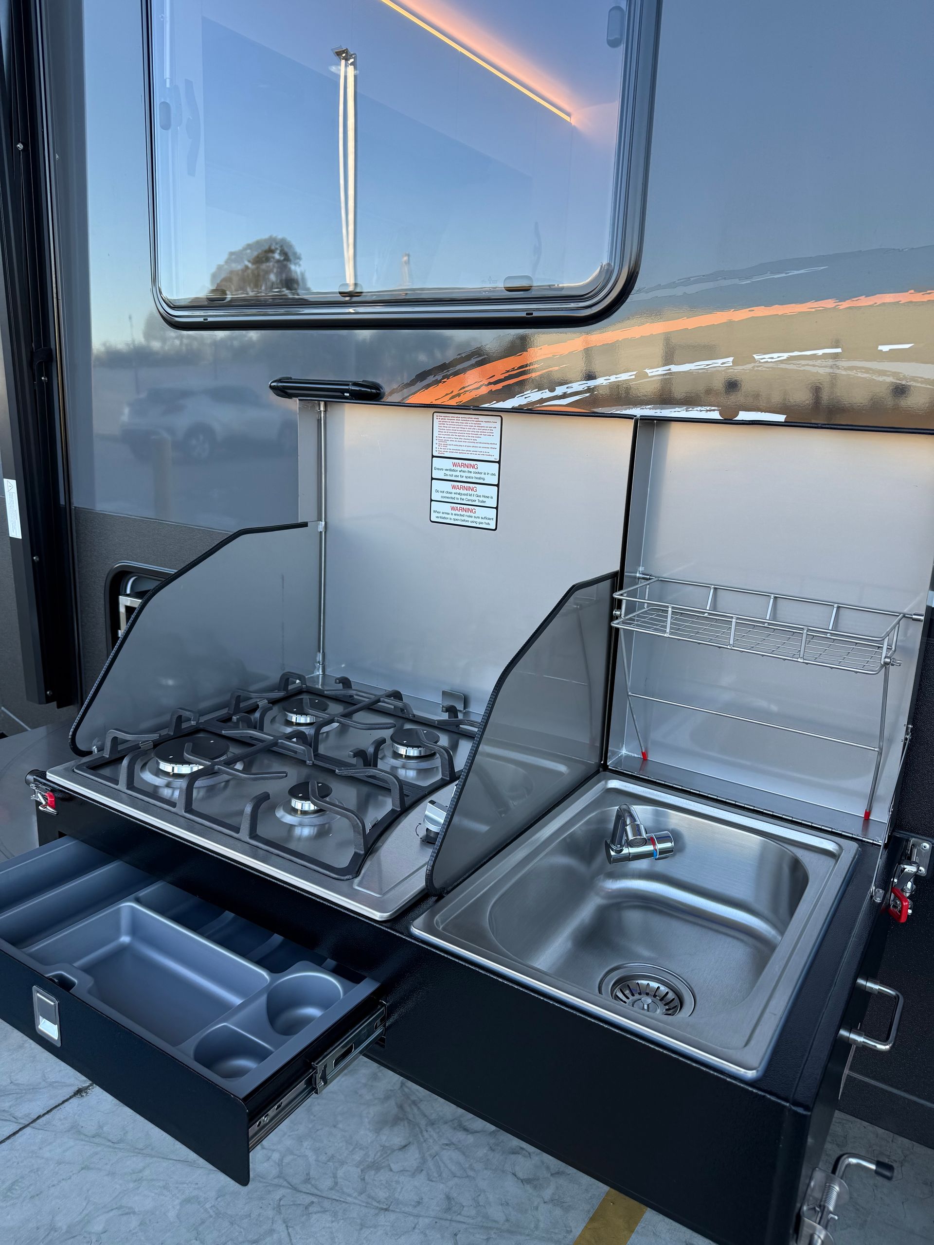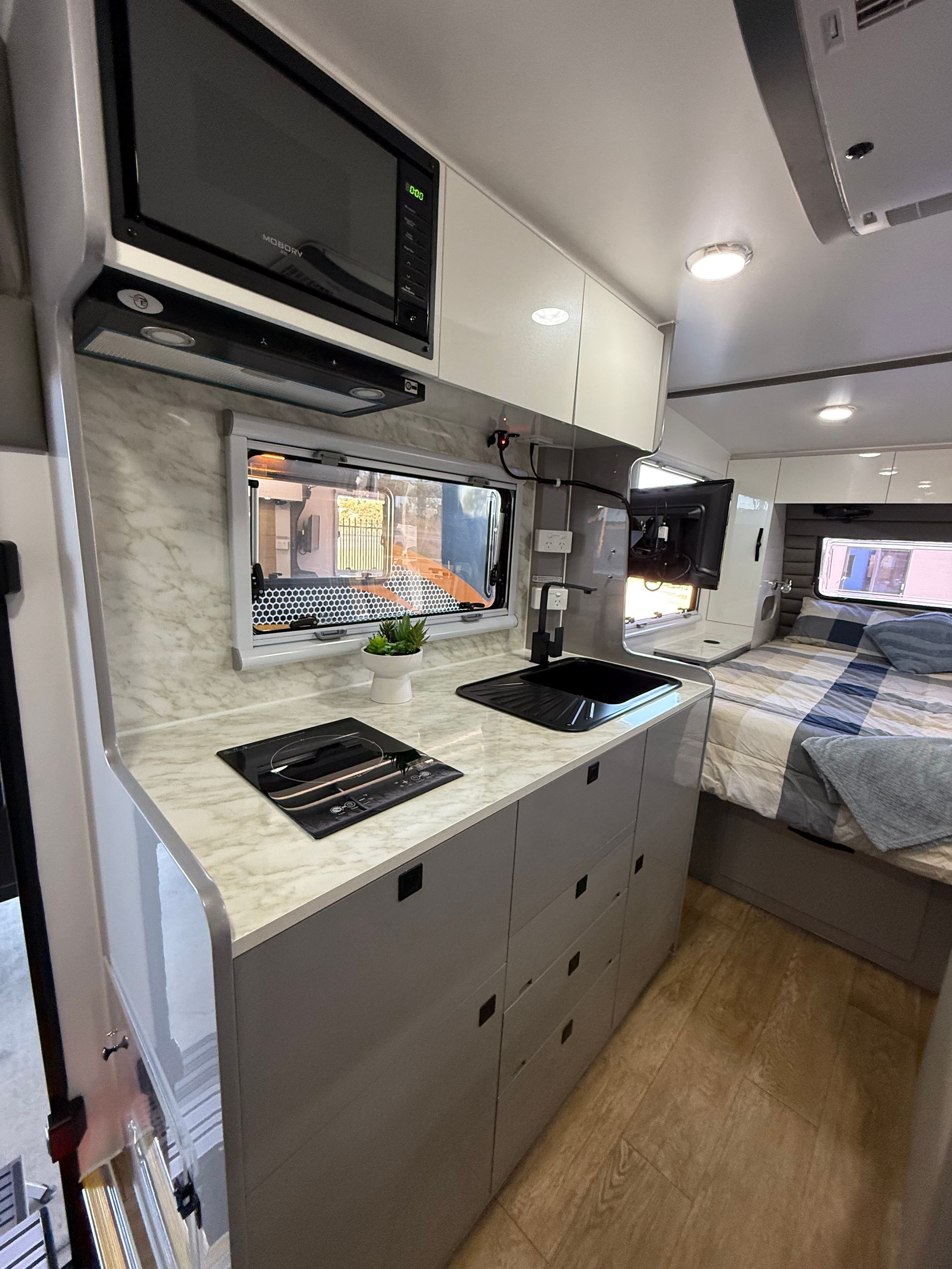 The GR17.6 is also equipped with an indoor kitchenette, complete with a built-in microwave, induction cooktop, full size fridge/freezer and even a kitchen sink!