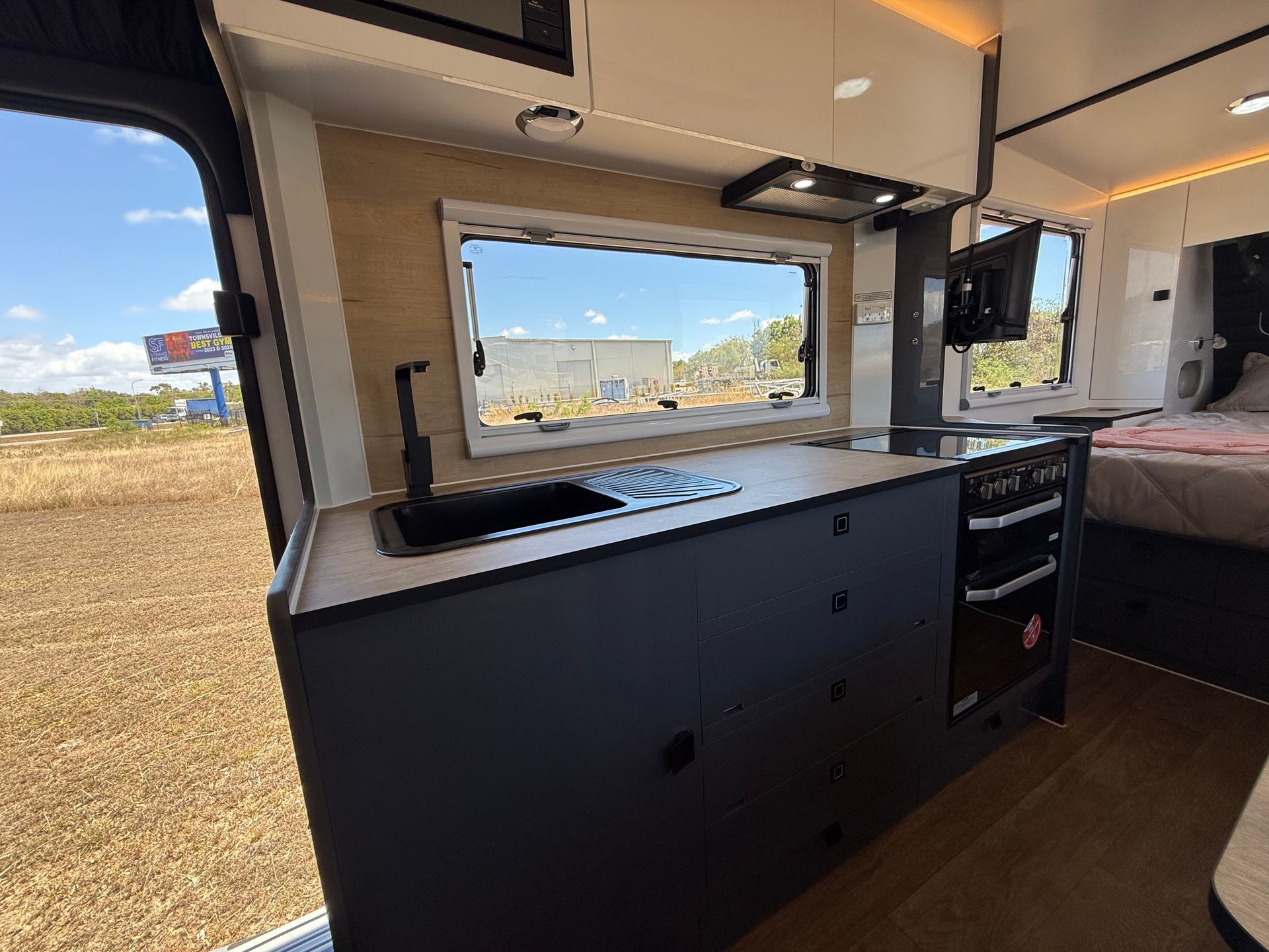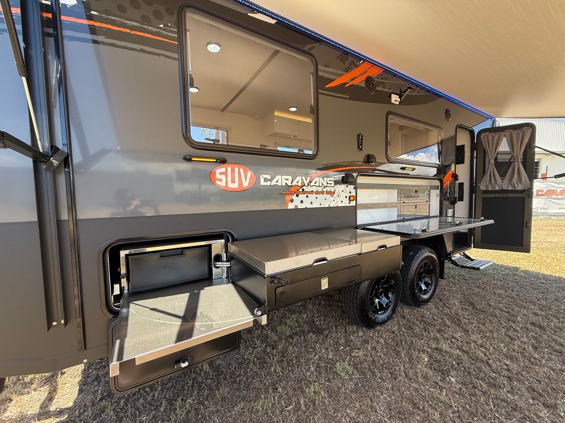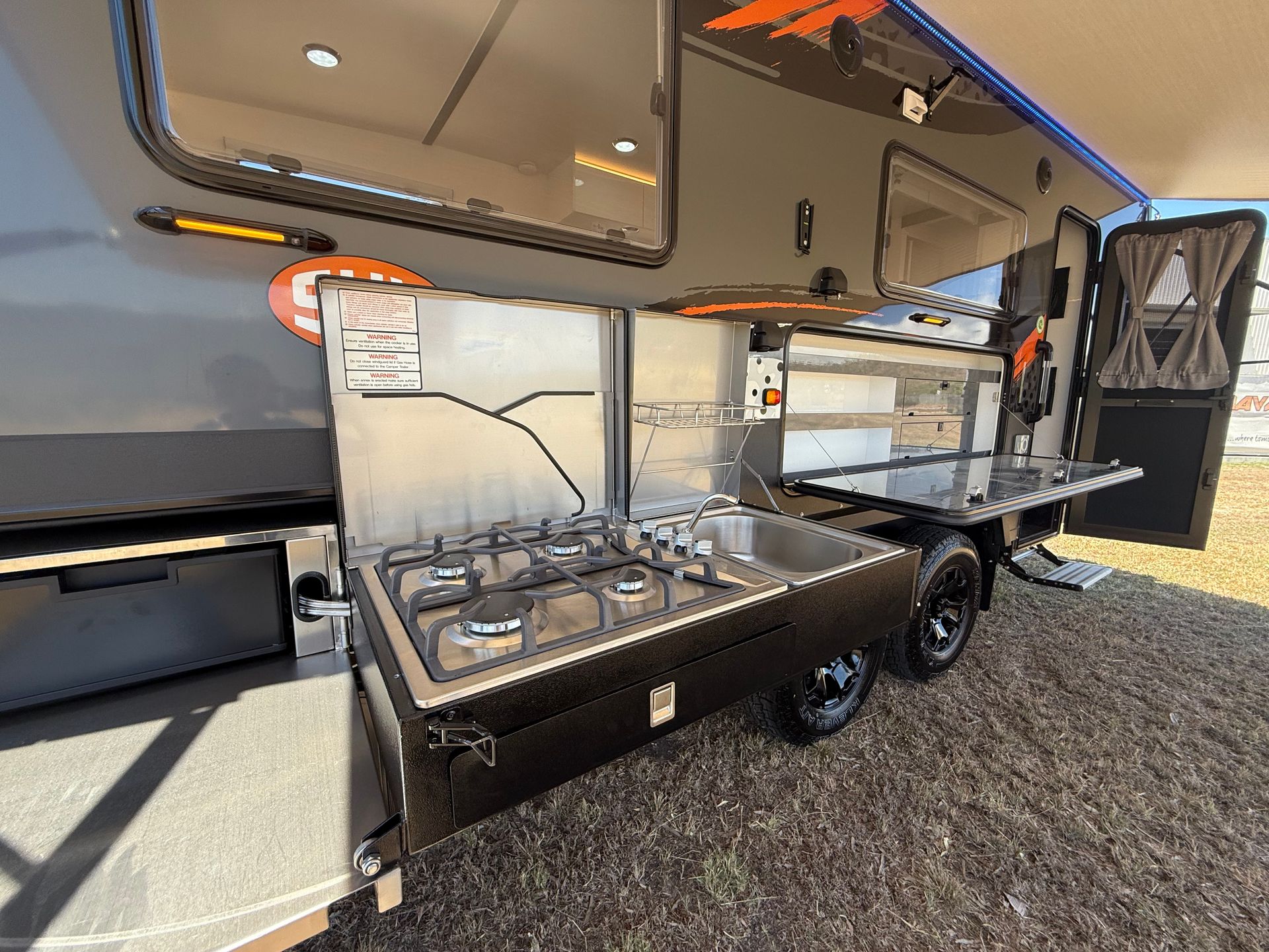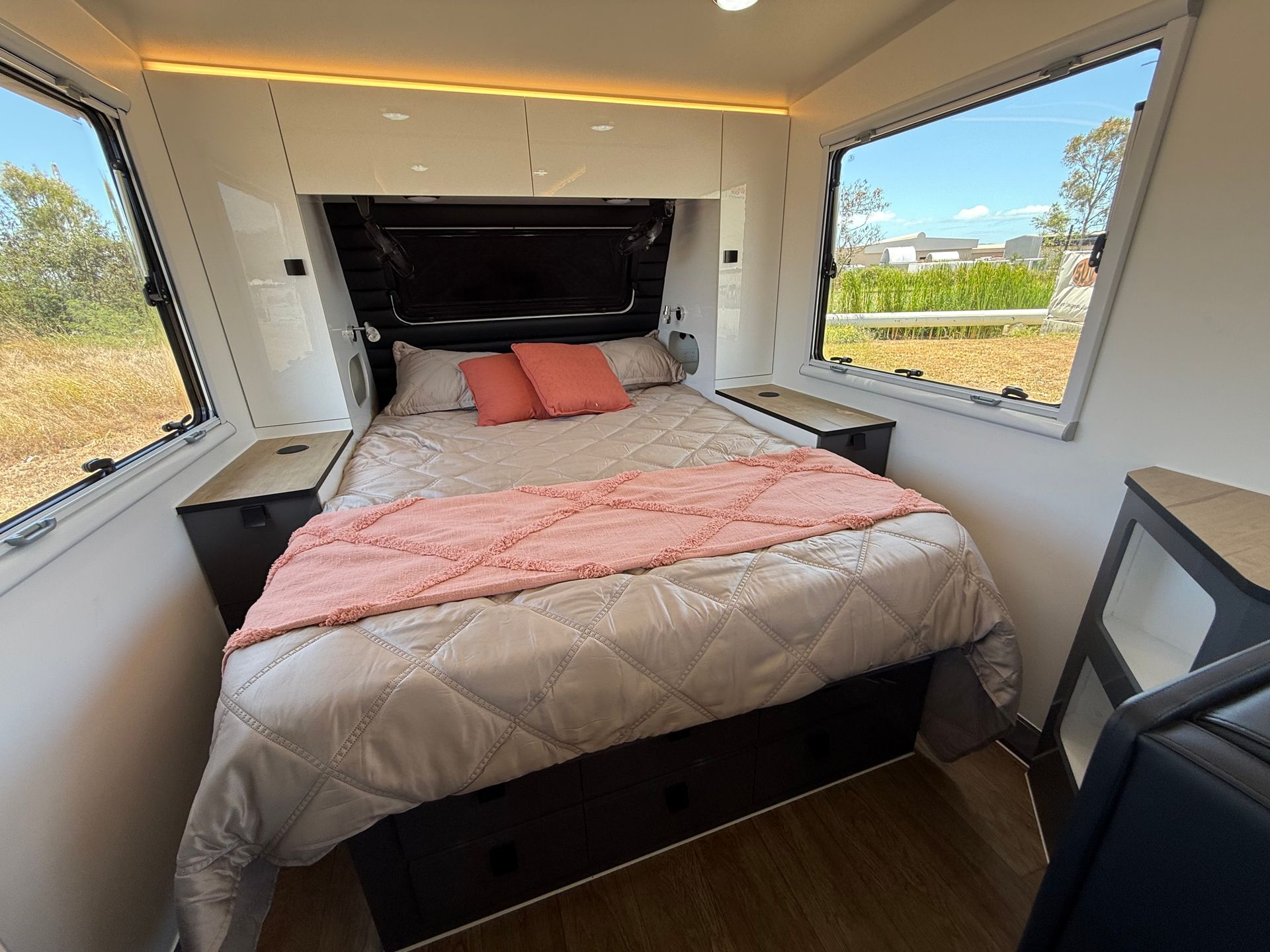 Step inside and you’ll be greeted with our signature walk-around island bed, offering comfort and practicality from the get-go. Outside, the fully equipped external kitchen with fridge drawer pairs perfectly with the push-button rollout awning, creating the ultimate alfresco setup.