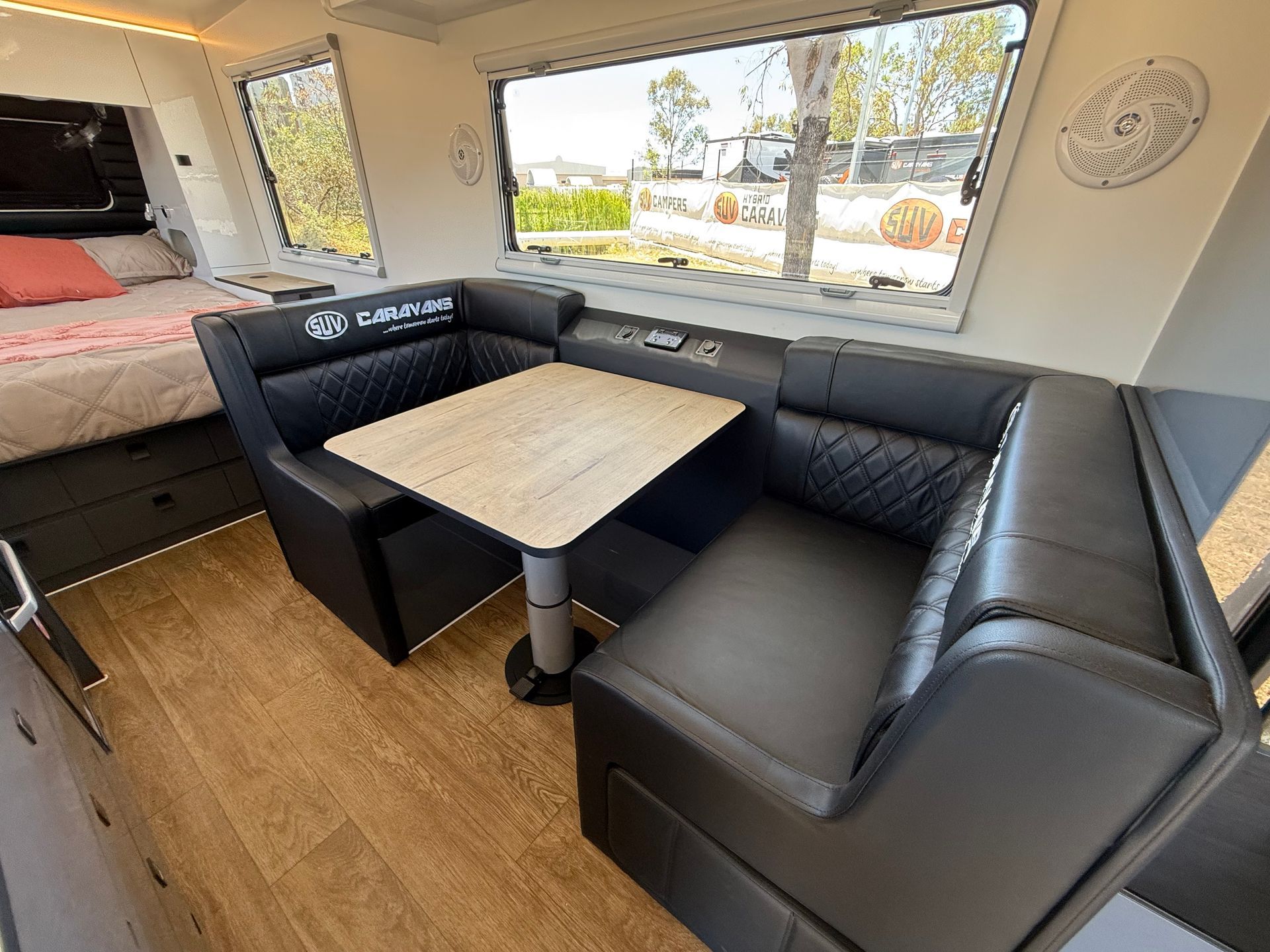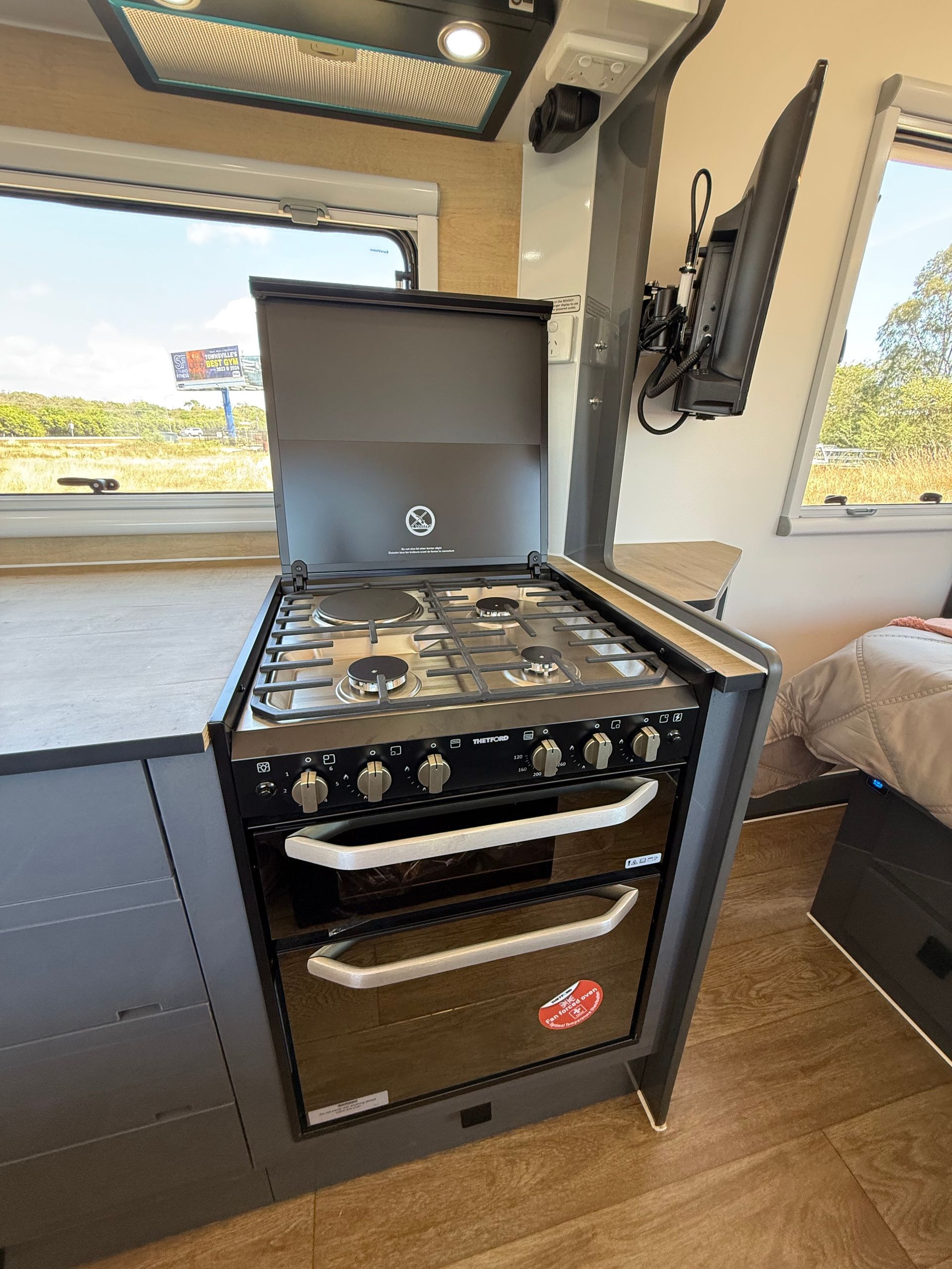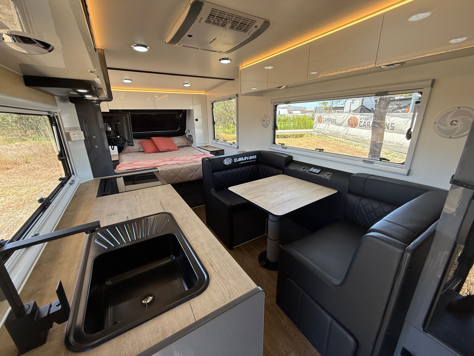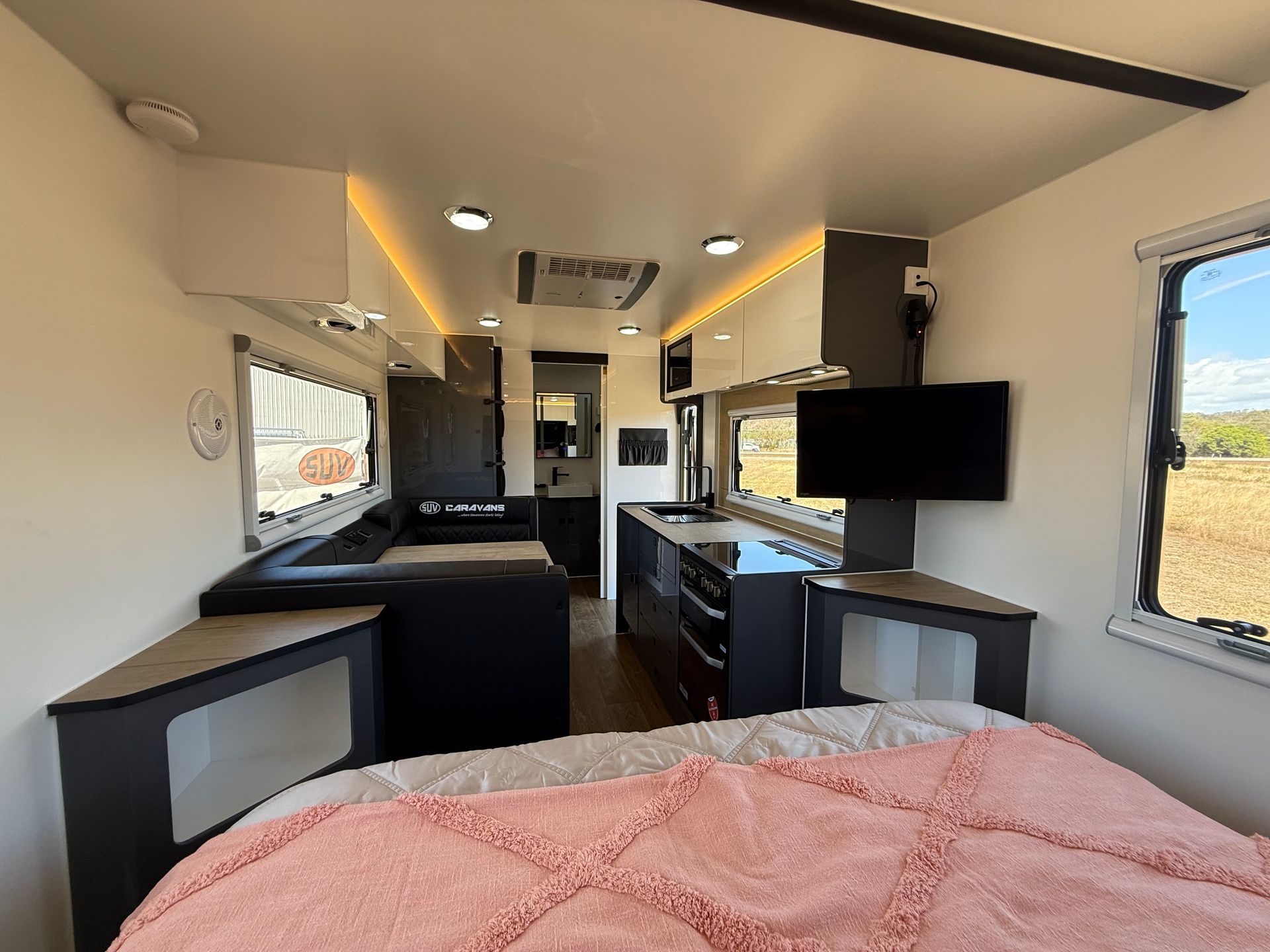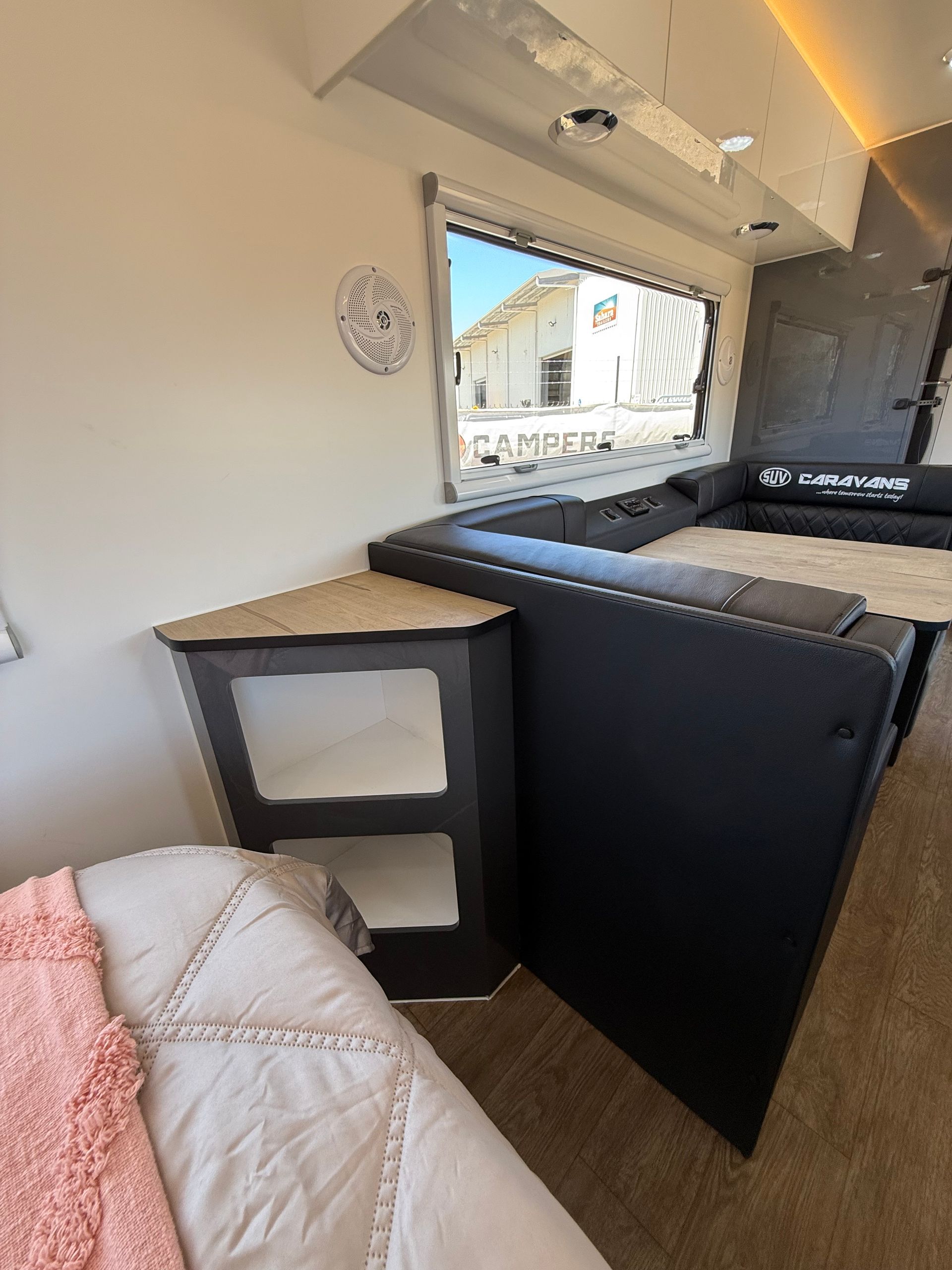 Step inside and you’ll be greeted with our signature walk-around island bed, offering comfort and practicality from the get-go. Outside, the fully equipped external kitchen with fridge drawer pairs perfectly with the push-button rollout awning, creating the ultimate alfresco setup.