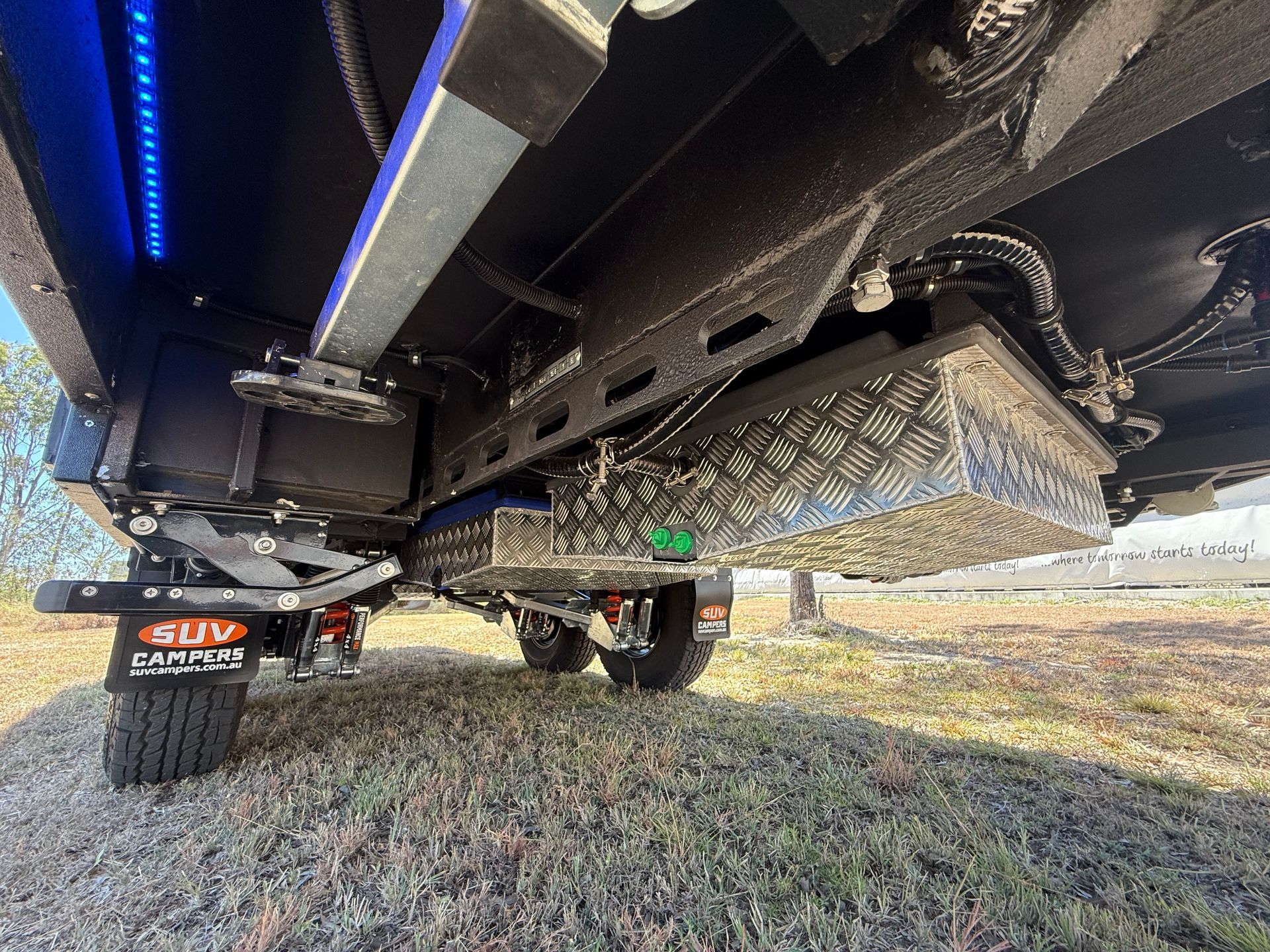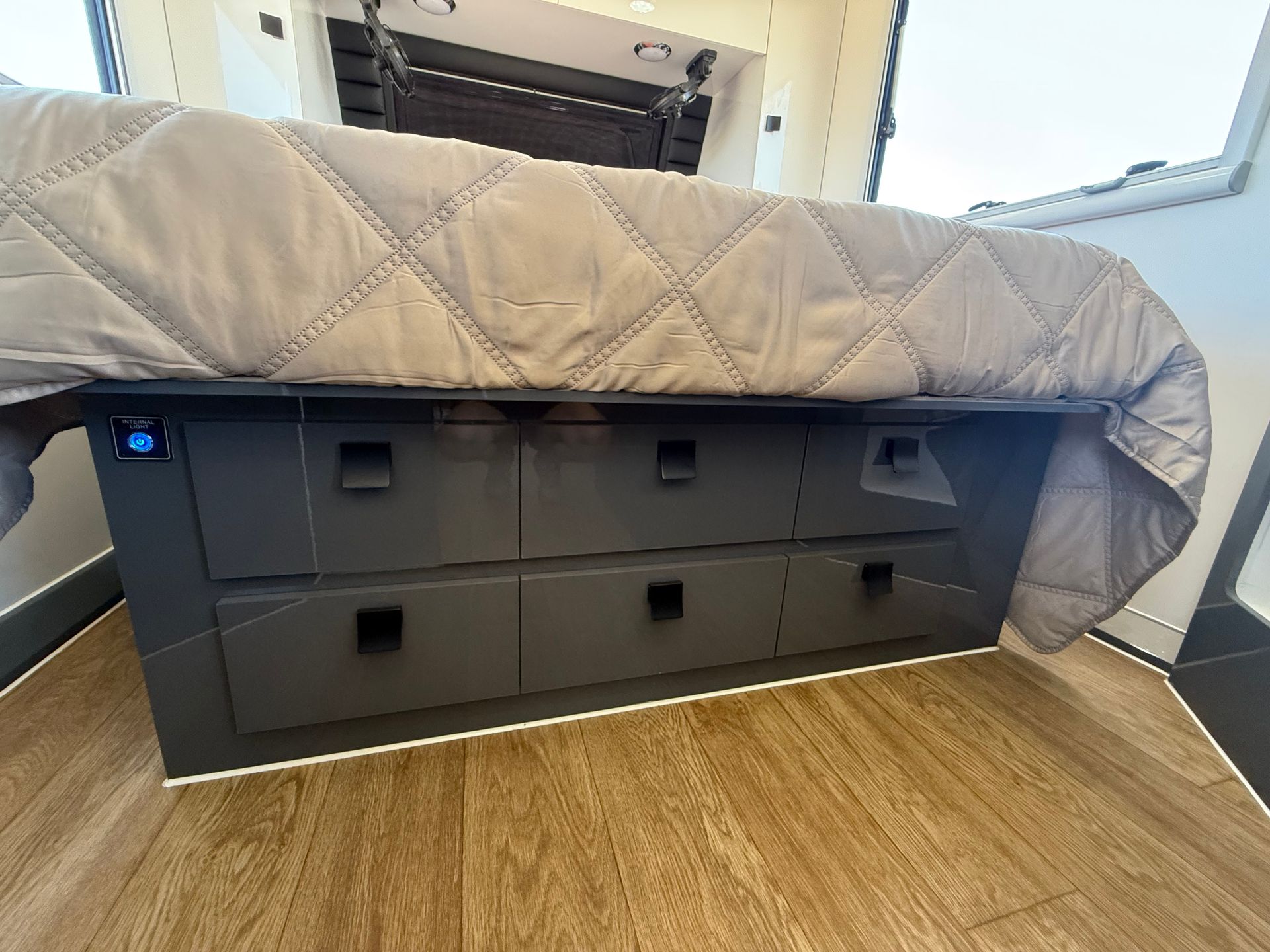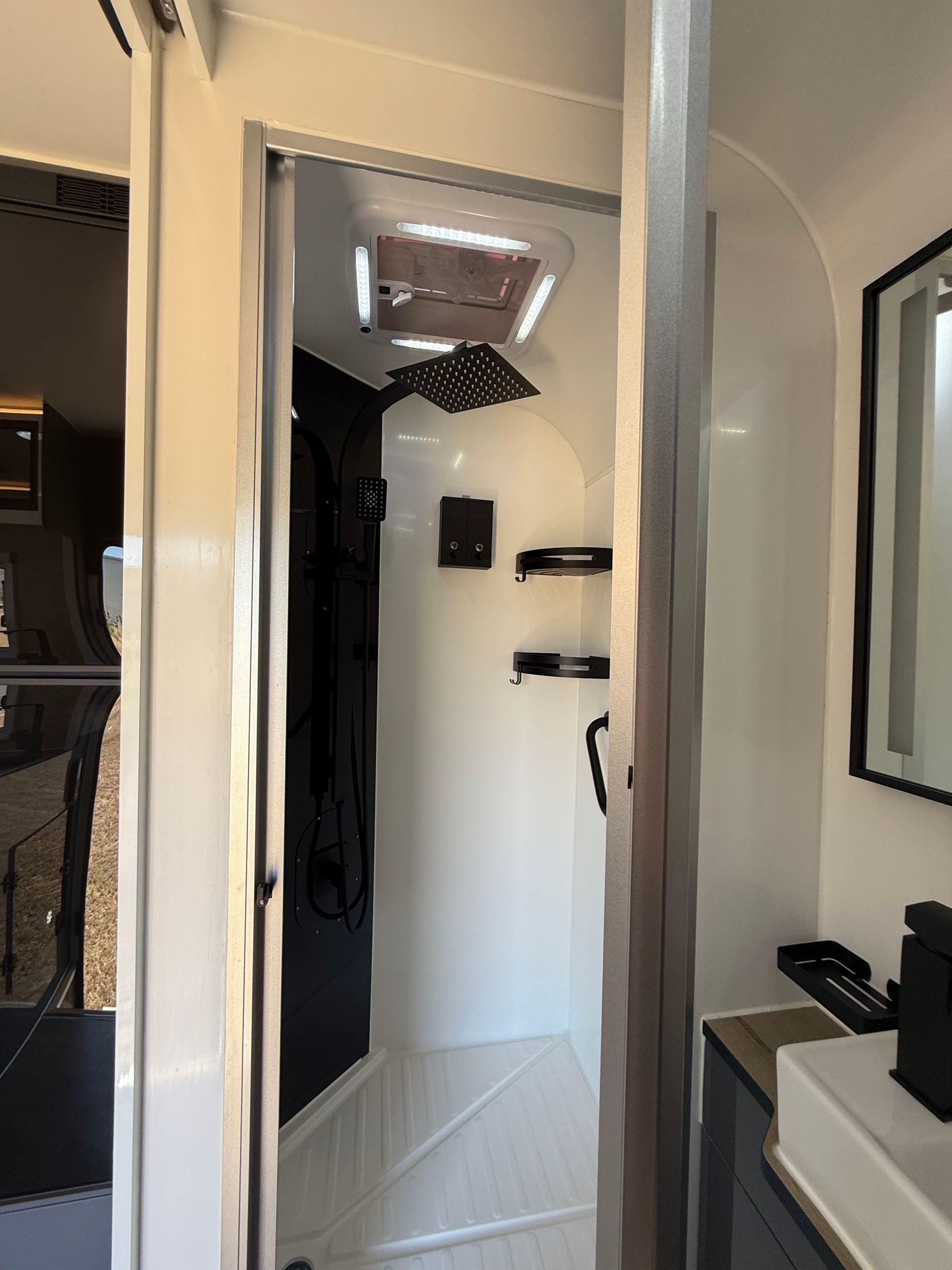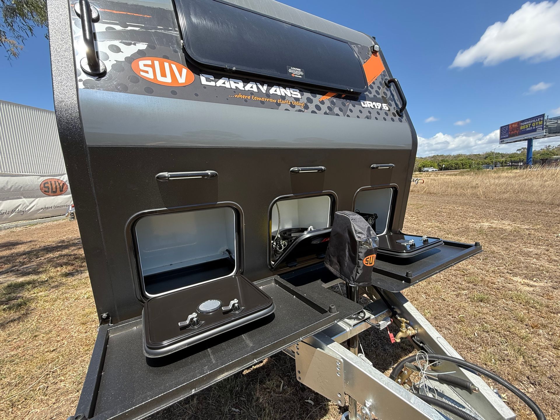 Step inside and you’ll be greeted with our signature walk-around island bed, offering comfort and practicality from the get-go. Outside, the fully equipped external kitchen with fridge drawer pairs perfectly with the push-button rollout awning, creating the ultimate alfresco setup.