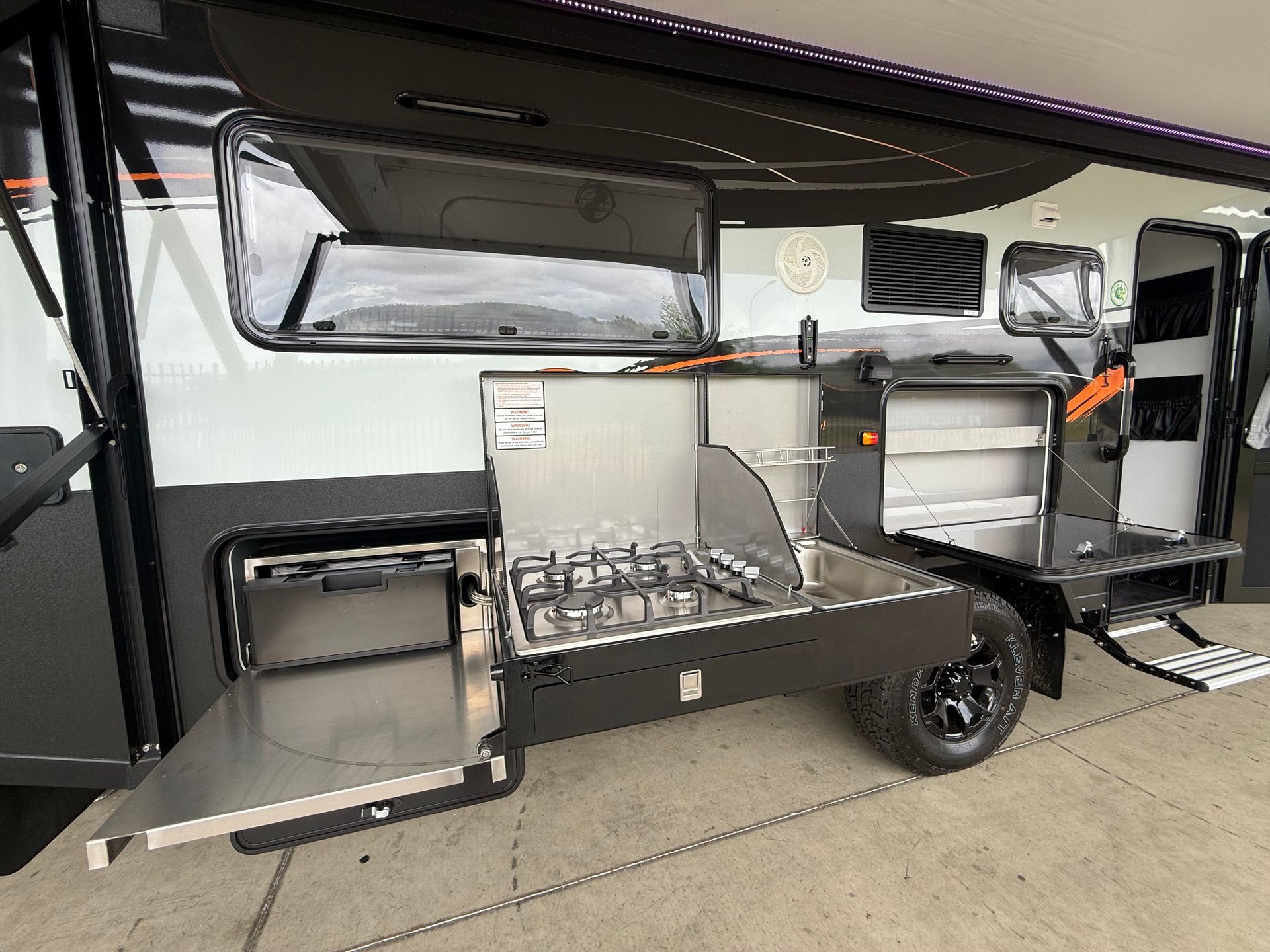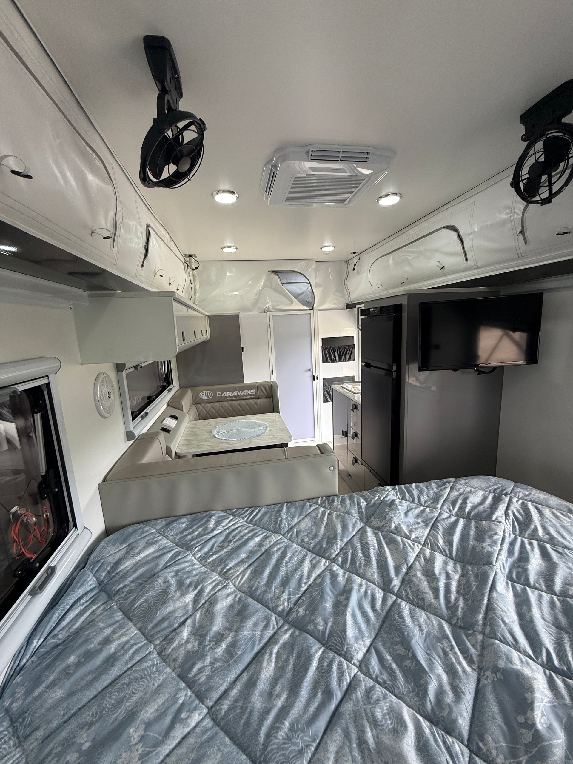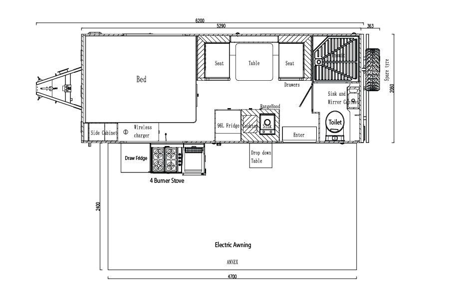 Enjoy the convenience of a separate toilet and shower ensuite, plus the flexibility of both an internal kitchen and an external swing-around kitchen, allowing you to cook wherever suits your setup. With a generous 200L water capacity, the Mantaray Bay is well suited for extended off-grid stays.